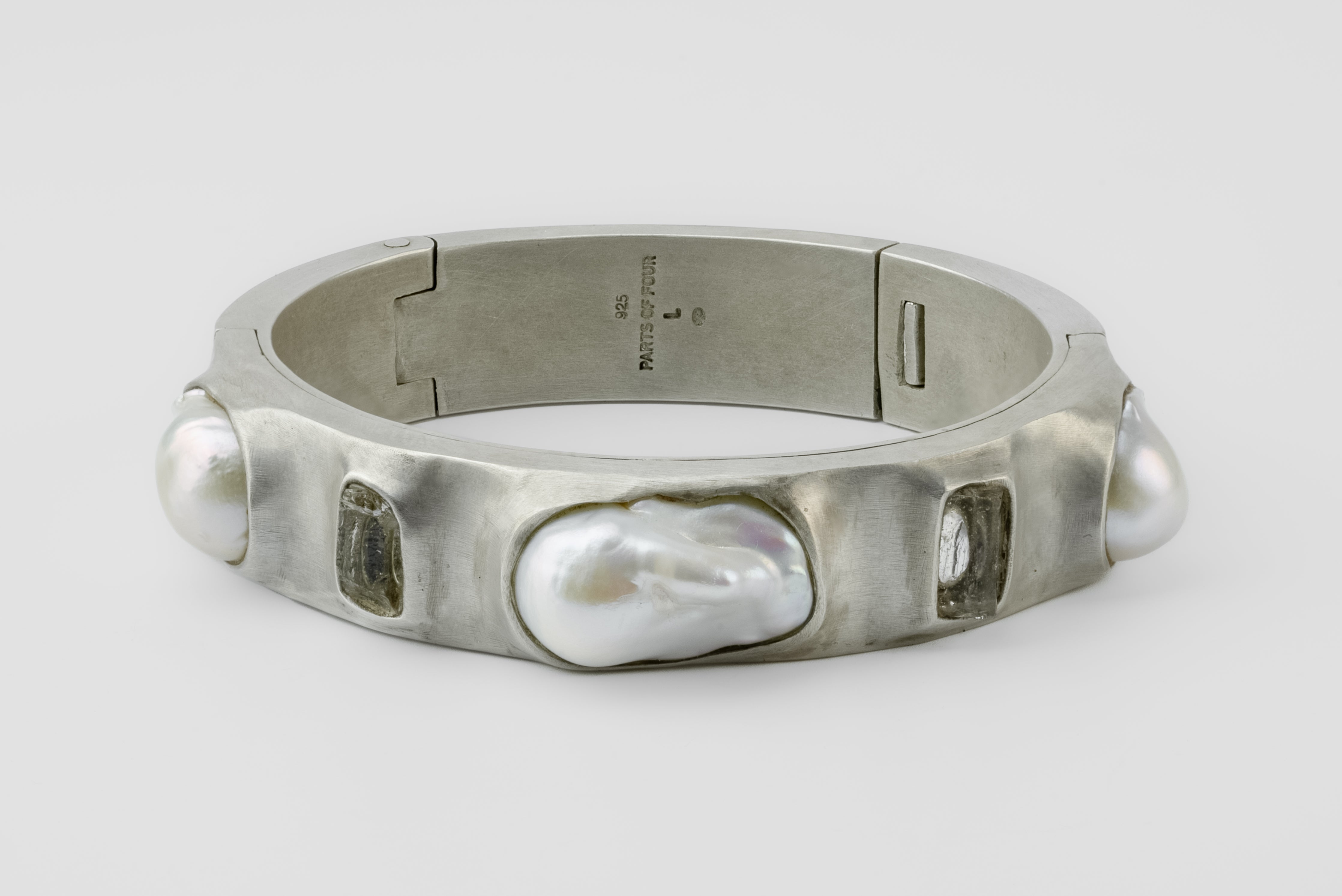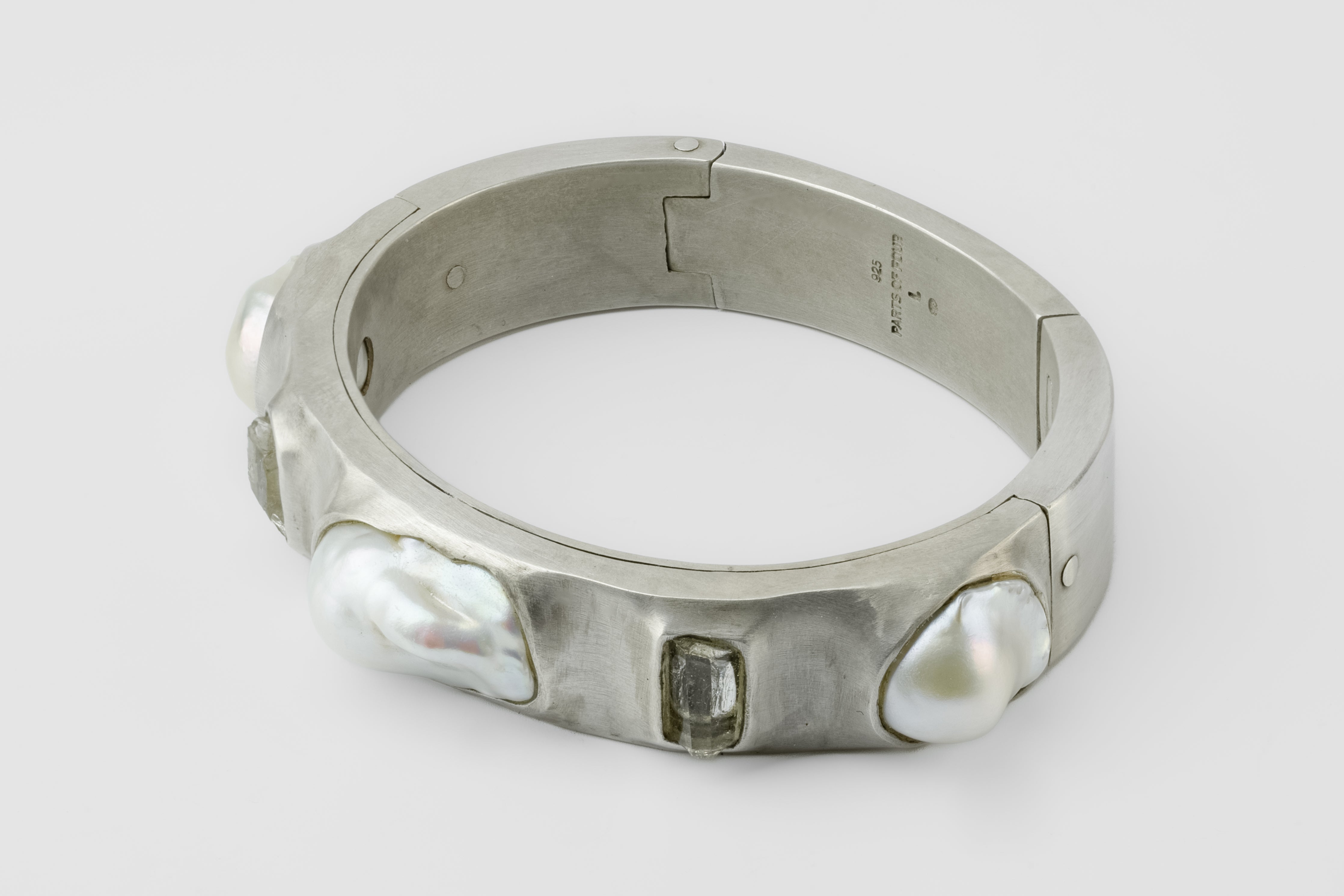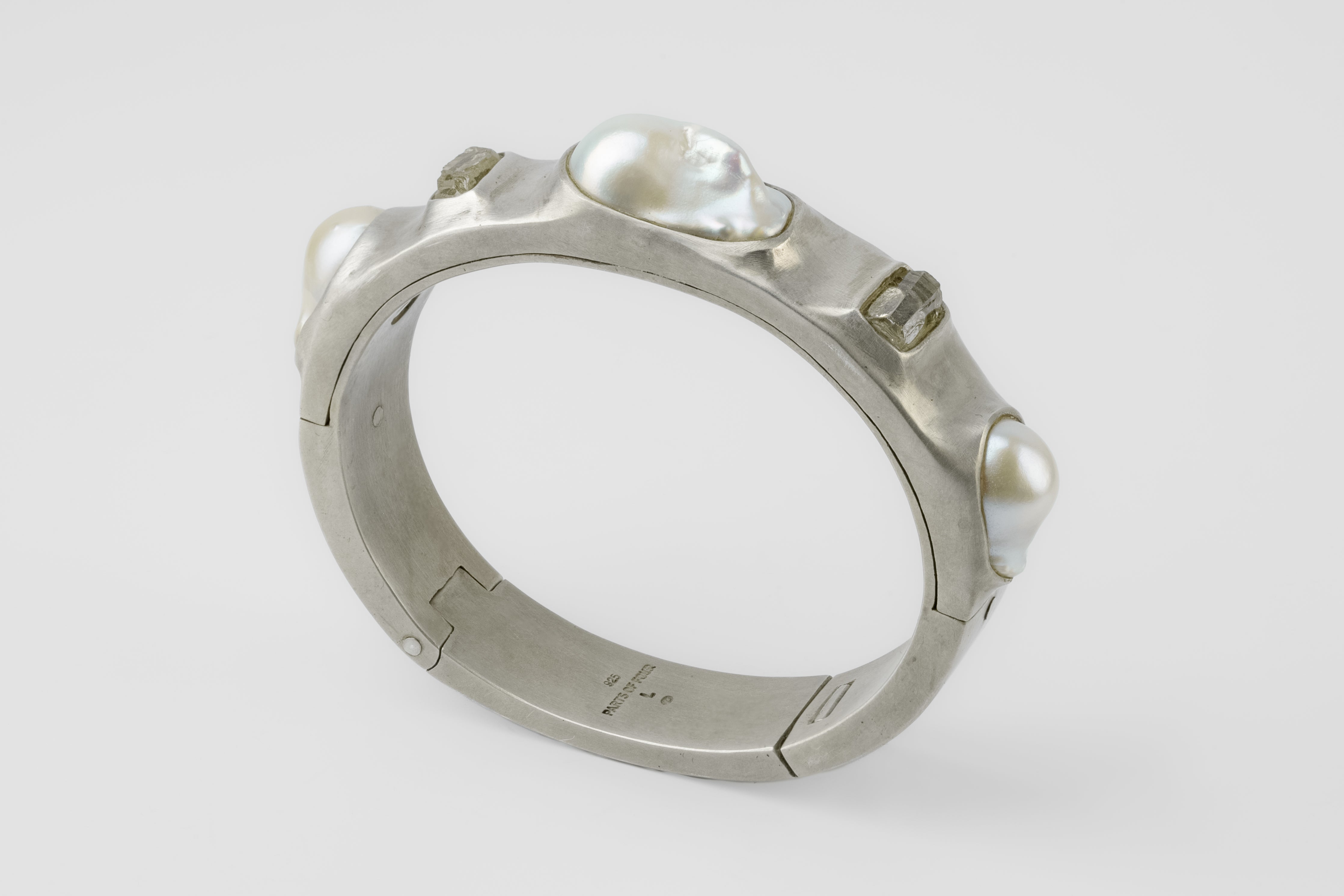 | Colors: | DA: Dirty Sterling. Sterling silver, dipped in acid to create a subdued surface. Results will never be identical, and this nuance / variation should be seen as a characteristic of the uniqueness of the product. WPRL: White Pearl. Baroque tear-dropped saltwater pearls. These are wild and natural bead specimens. TBER: Titanium Beryl. Titanium Beryl |
