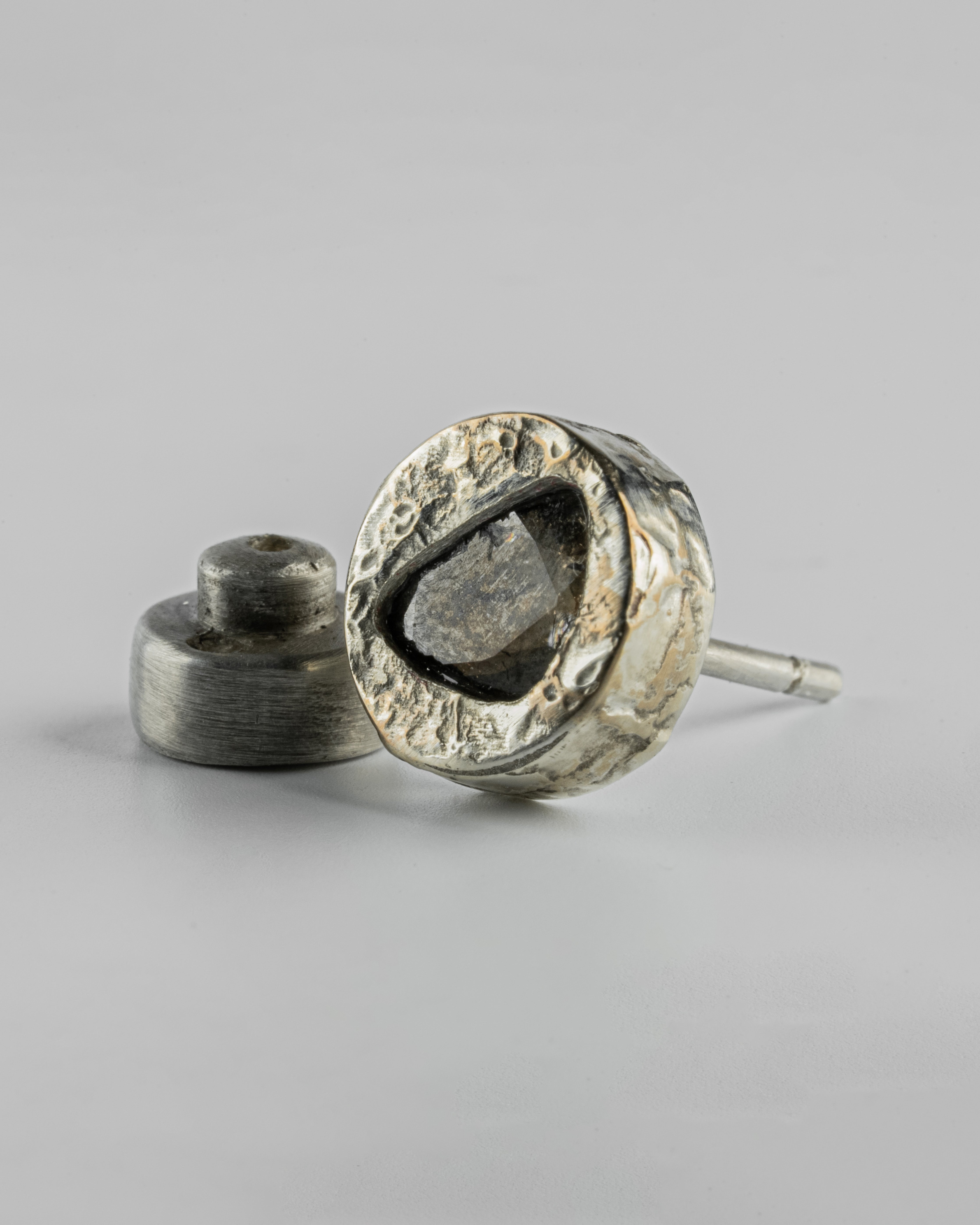 | Colors: | DA10KW: Dirty 10K White Gold Skin. Dirty sterling silver (acid treated) with fused layer of 10K white gold DIA: Rough Diamond. The stones used in this item are cuts of diamond material that are removed from a larger chunk of diamond as they are attempting to get to the perfect diamond in the center. Each stone fragment and shape are absolutely unique. |