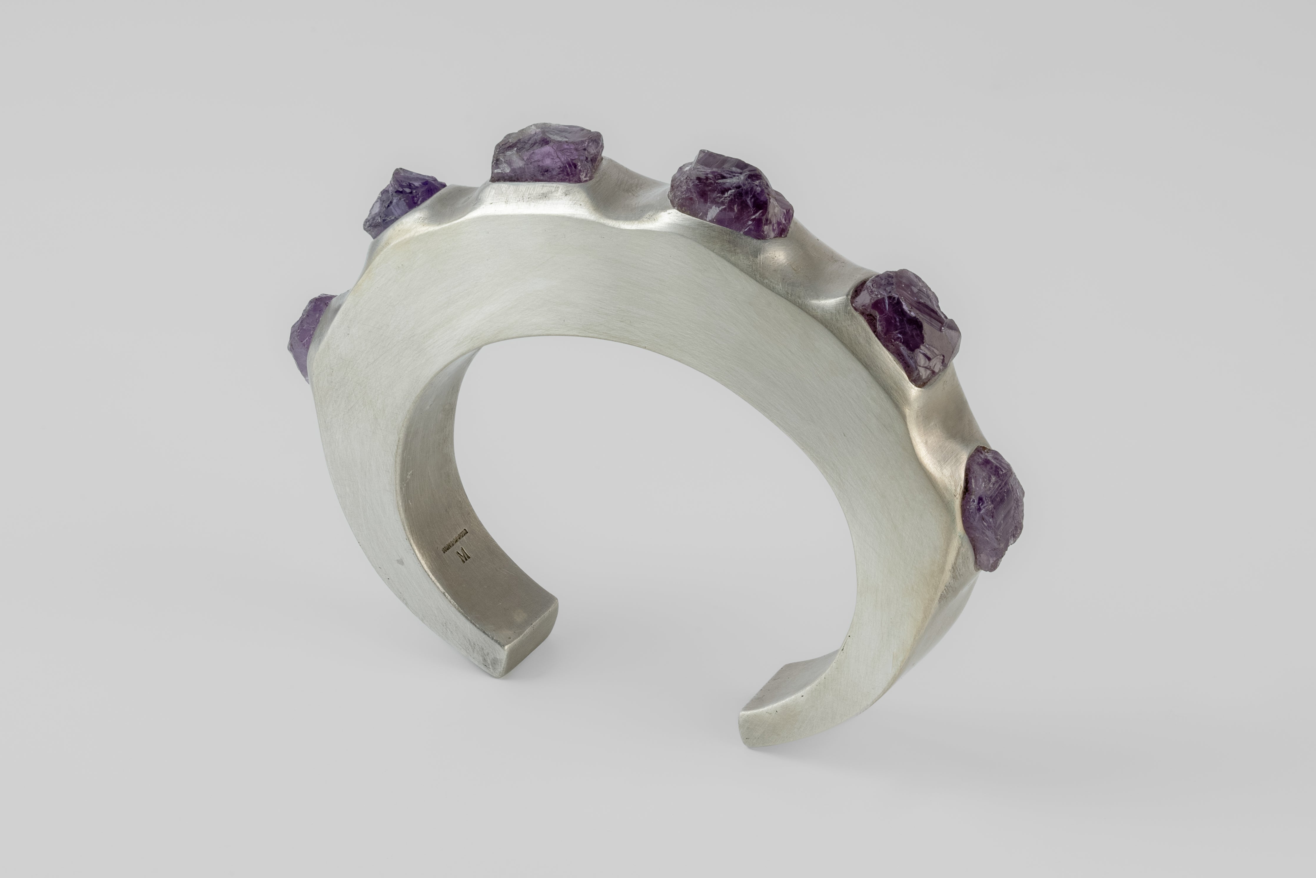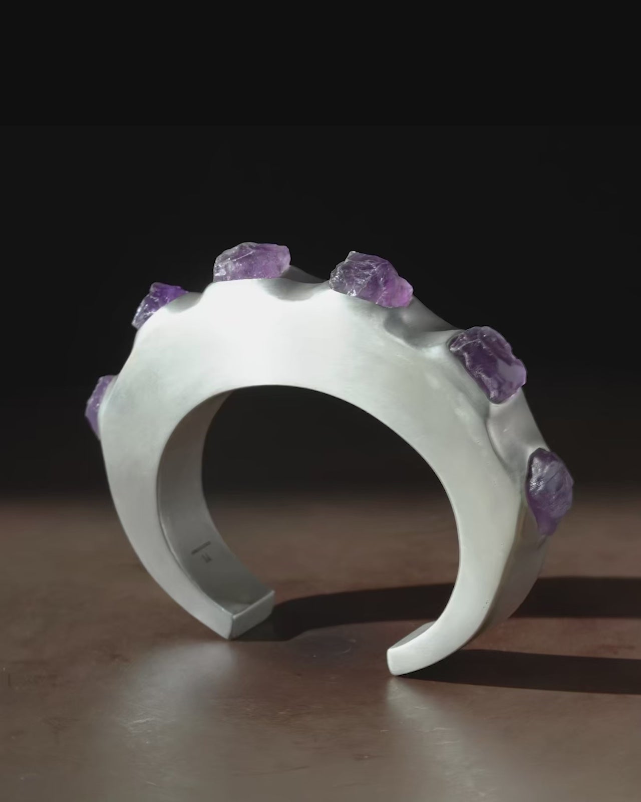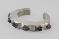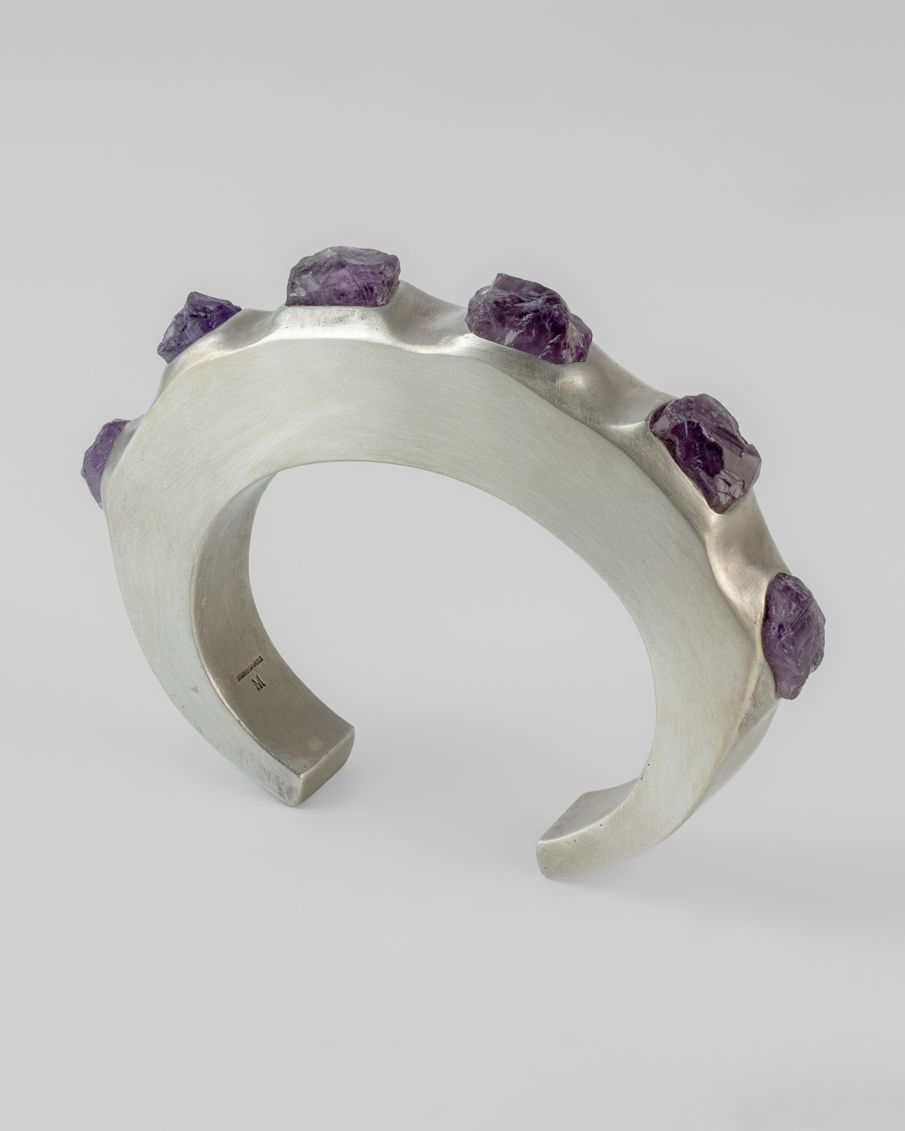 | Colors: | AS: Acid Silver. Brass substrate is electroplated with silver and then dipped into acid to create the subtly destroyed surface. The concentration of the plating solution, air temperature and time in the acid bath all play integral roles in the final result and exist in a delicate balance. No two items are the same and these nuances / variations should be seen as a characteristic of the product. AME: Amethyst. |