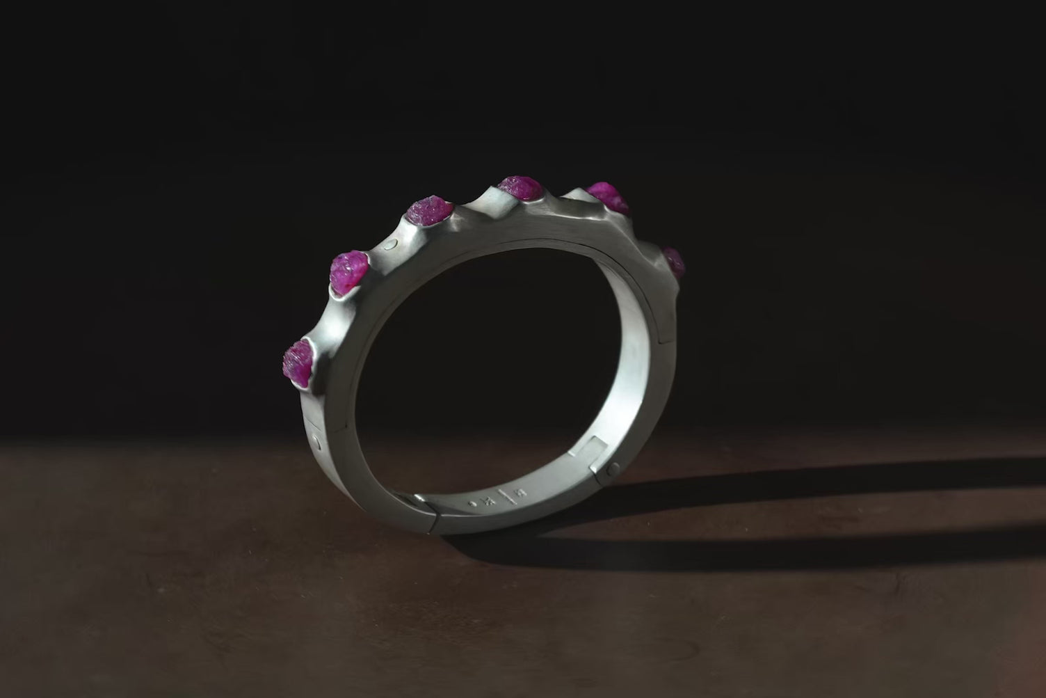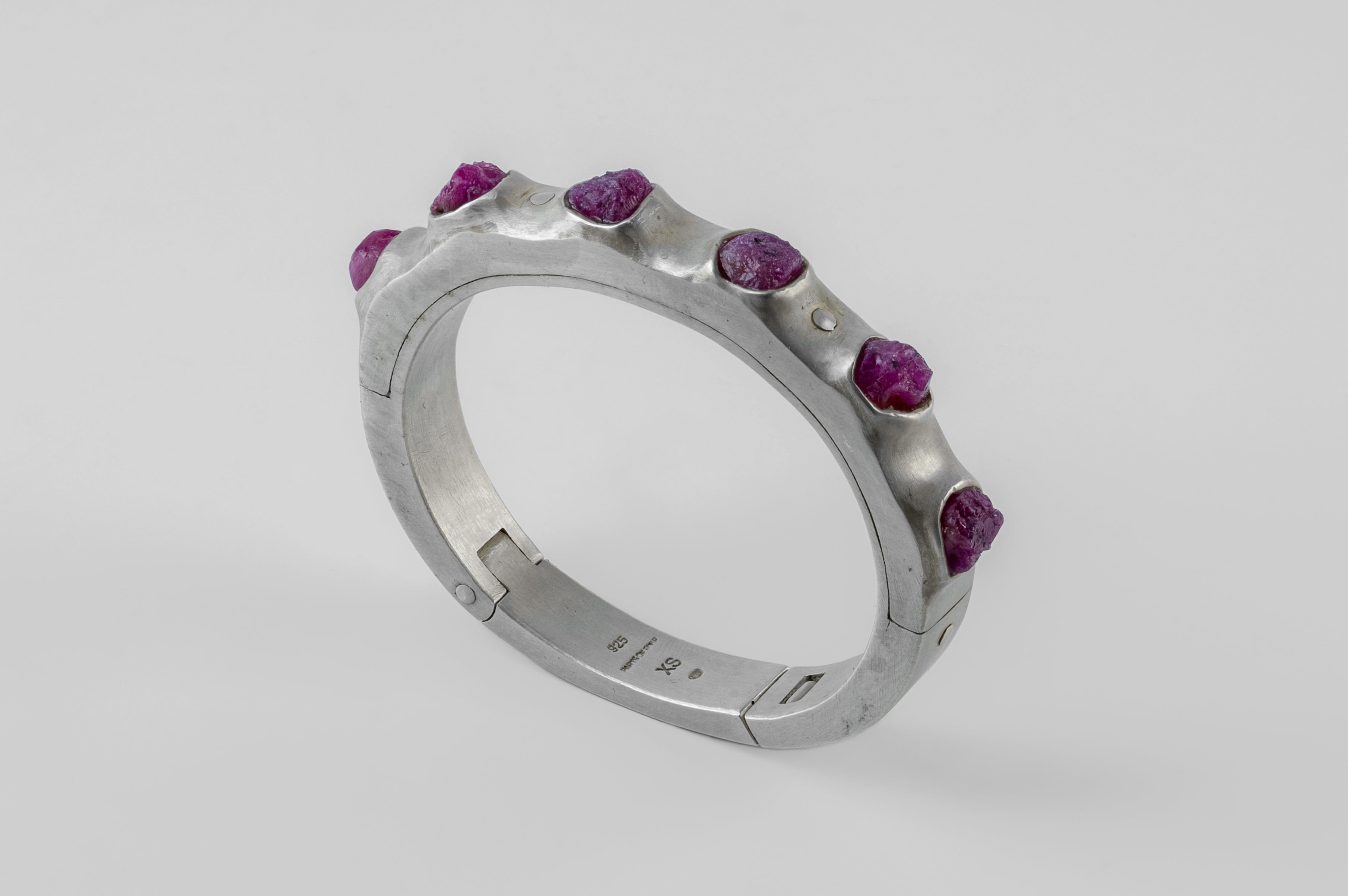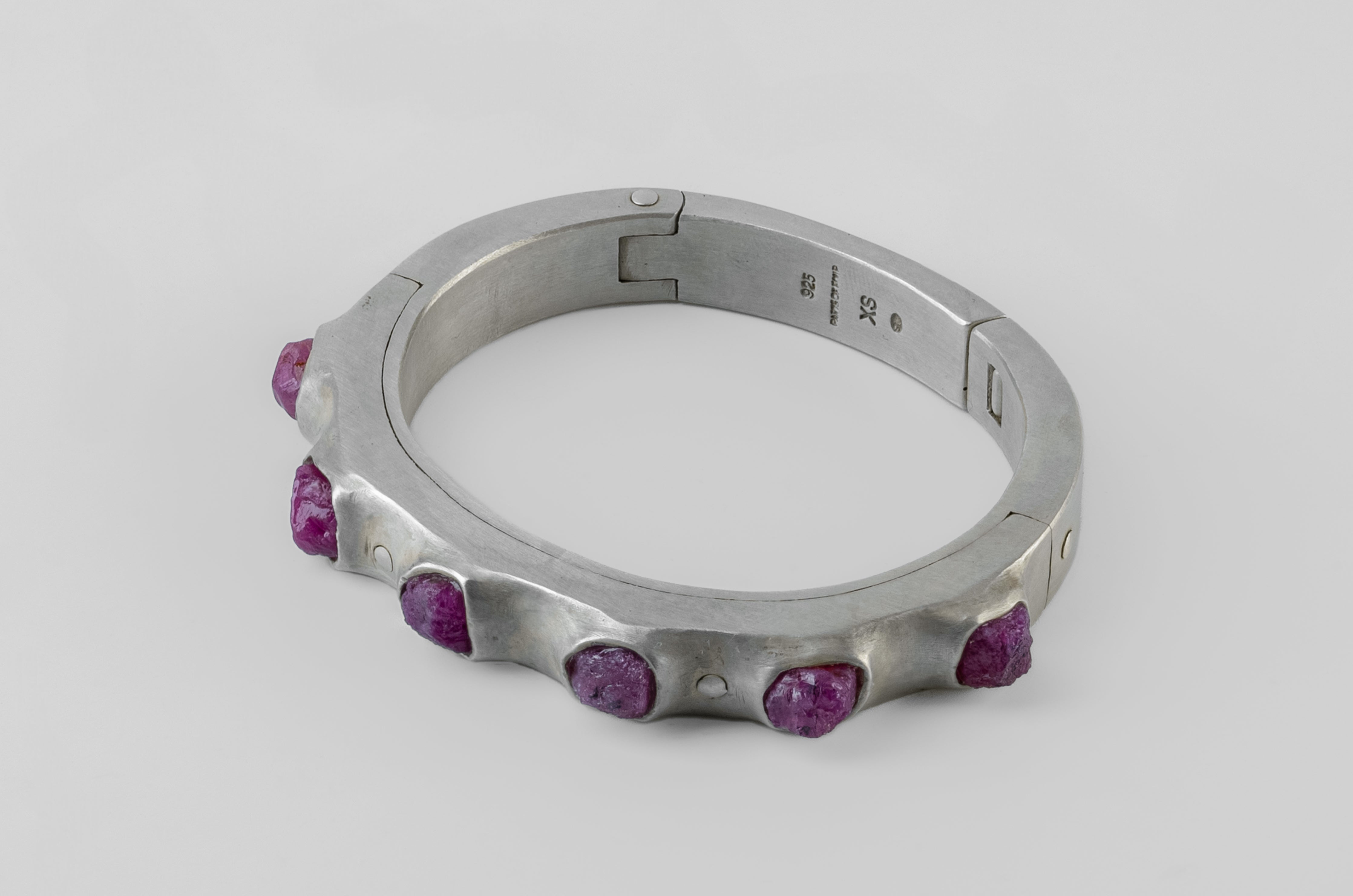 | Colors: | DA: Dirty Sterling. Sterling silver, dipped in acid to create a subdued surface. Results will never be identical, and this nuance / variation should be seen as a characteristic of the uniqueness of the product. DRUS: Dirty Ruby Slabs. Slabs of rough harvested ruby, excavation quality. Un-polished. |