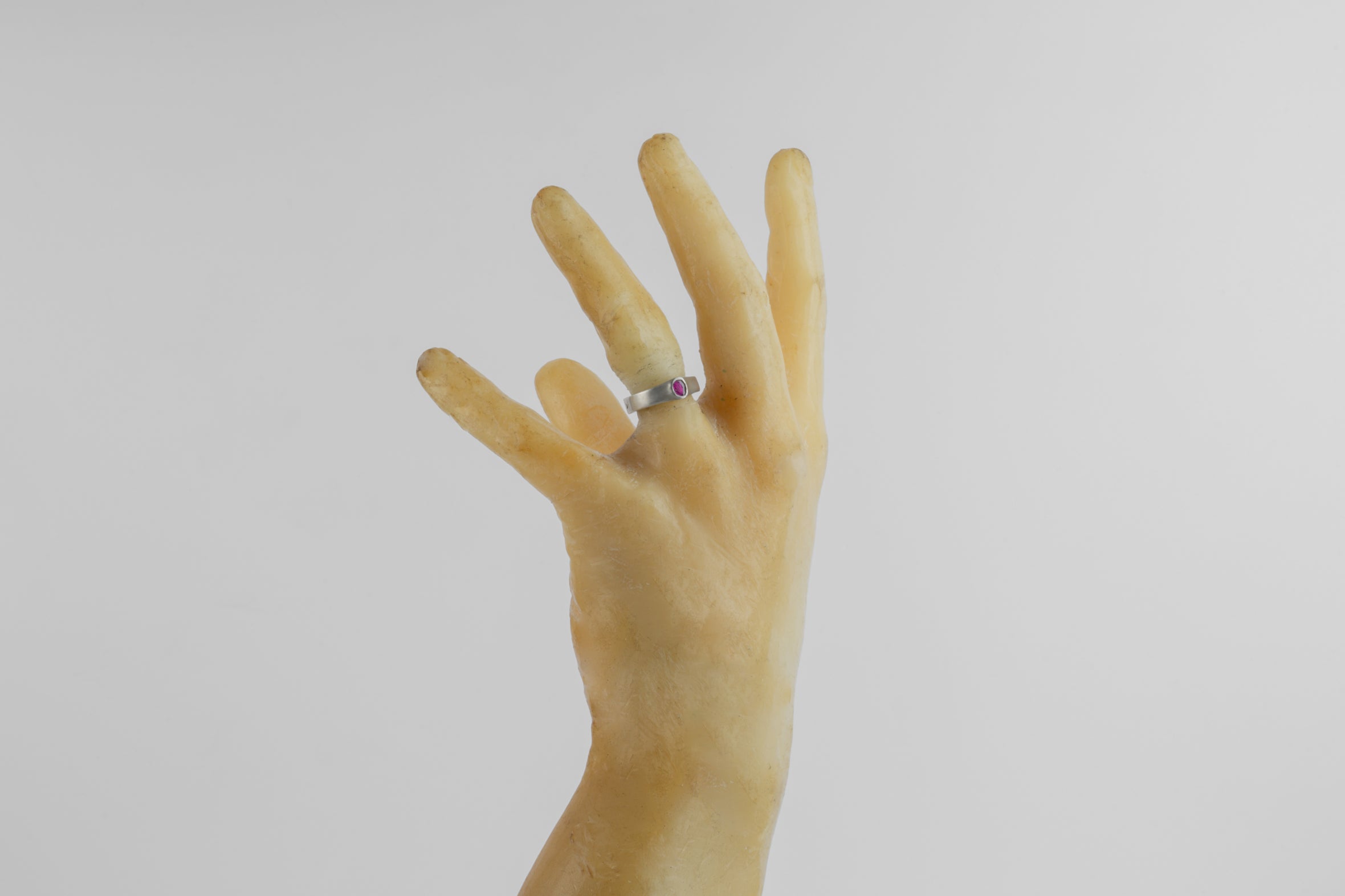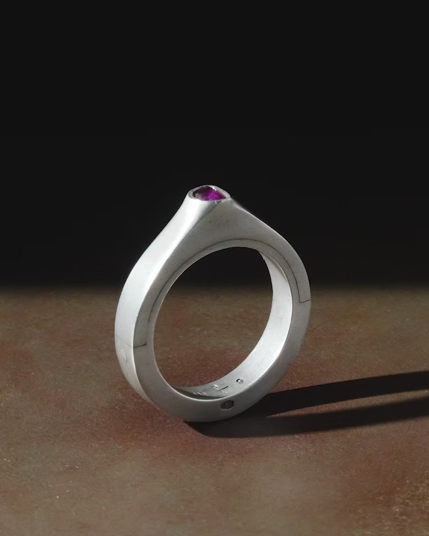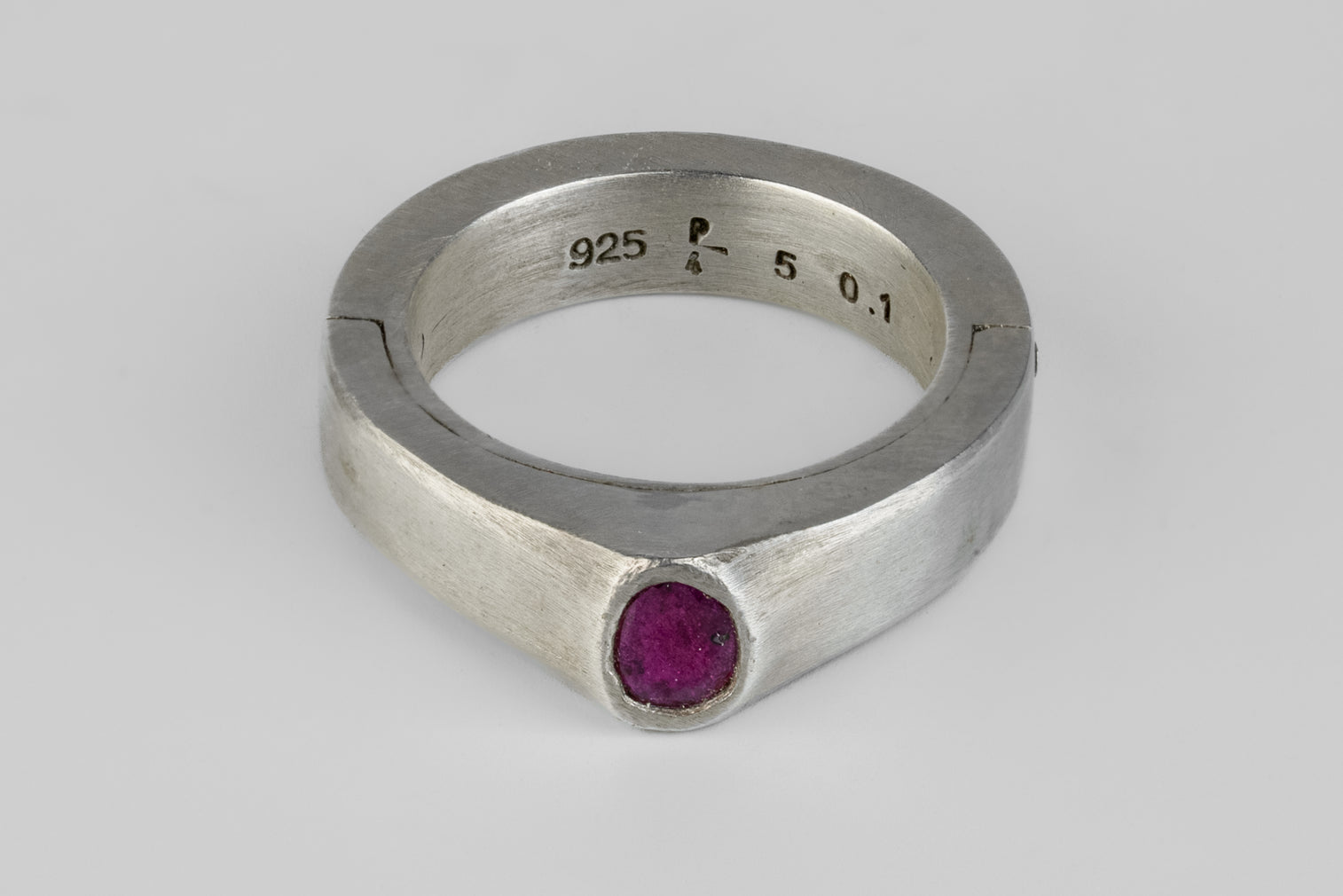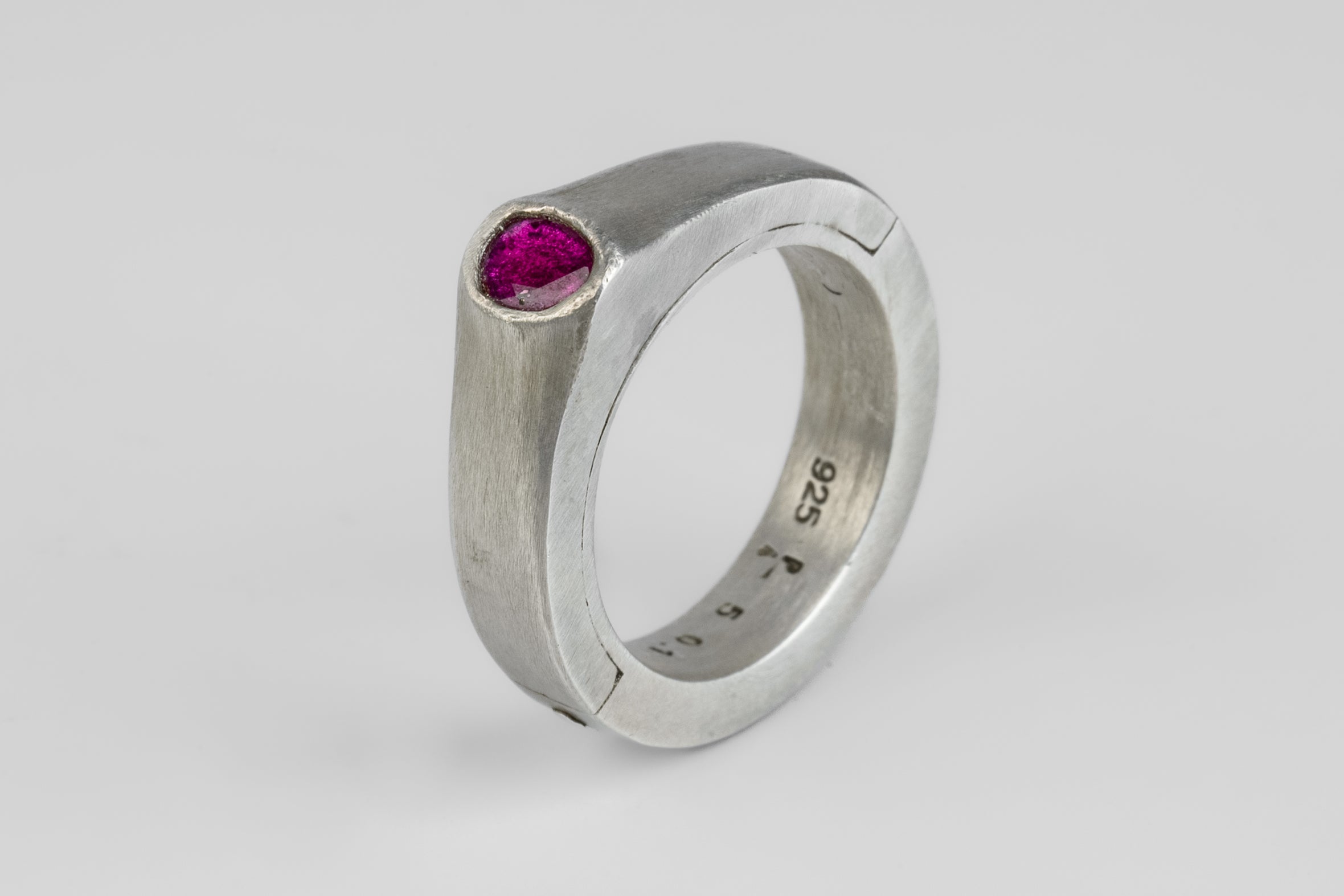 | Colors: | DA: Dirty Sterling. Sterling silver, dipped in acid to create a subdued surface. Results will never be identical, and this nuance / variation should be seen as a characteristic of the uniqueness of the product. RUB: Rough Ruby (Faceted). |