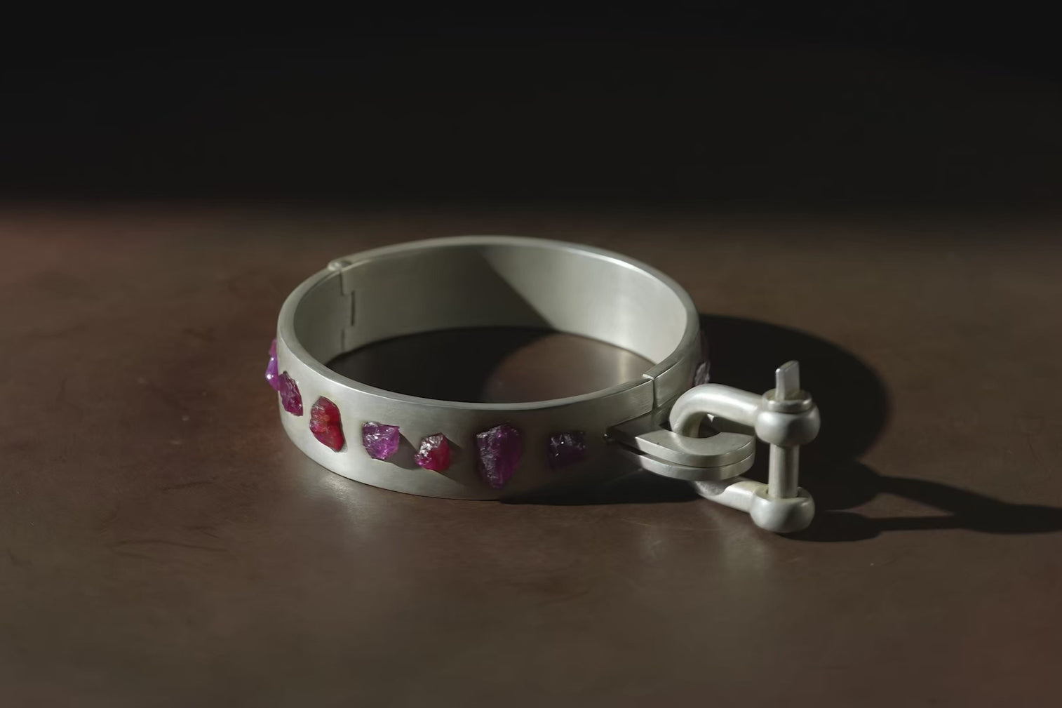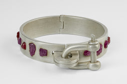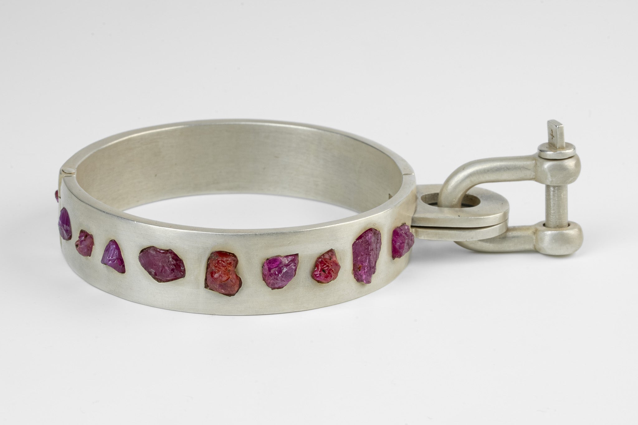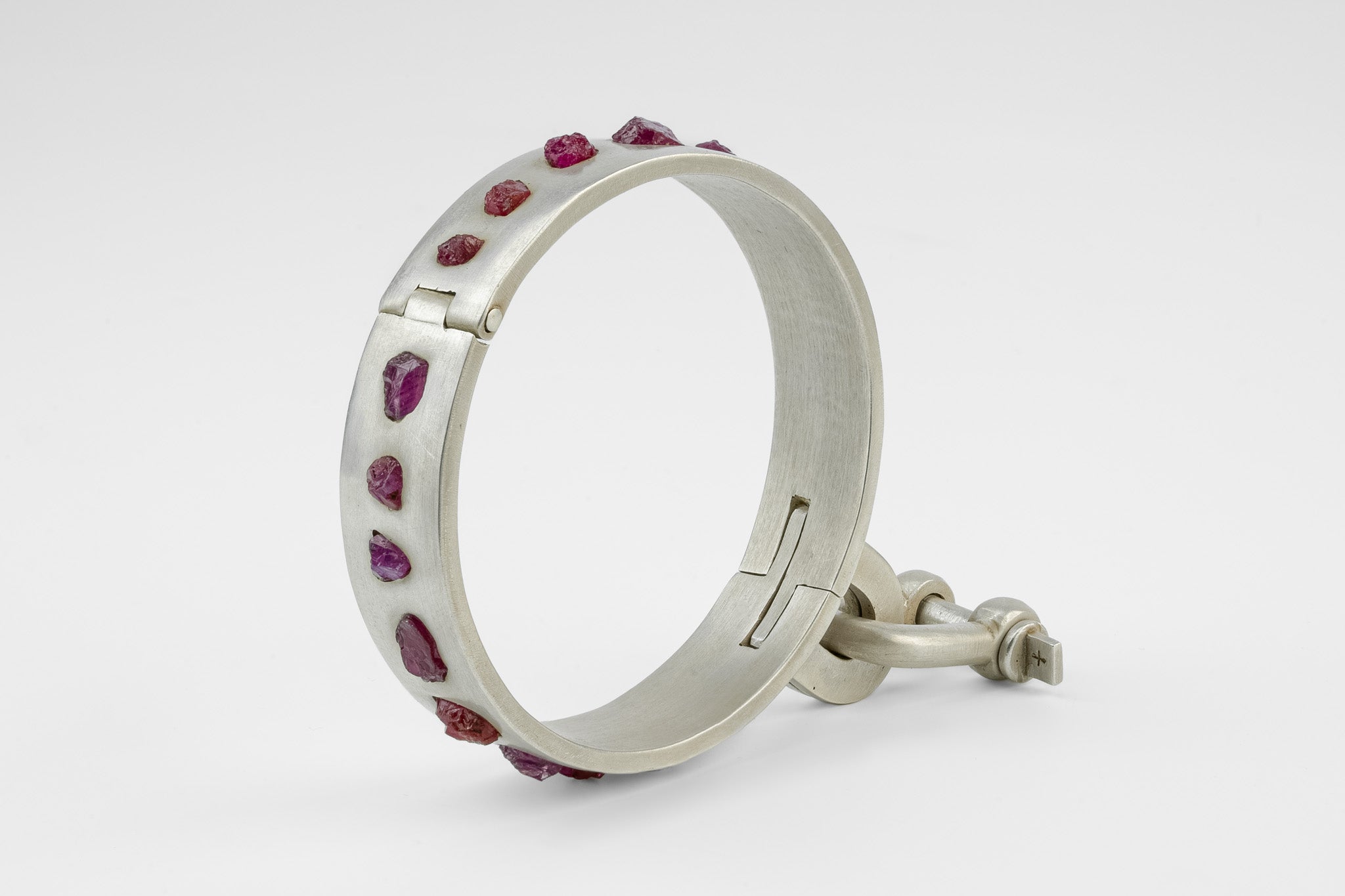 | Colors: | DA: Dirty Sterling. Sterling silver, dipped in acid to create a subdued surface. Results will never be identical, and this nuance / variation should be seen as a characteristic of the uniqueness of the product. DRUS: Dirty Ruby Slabs. Slabs of rough harvested ruby, excavation quality. Un-polished. |