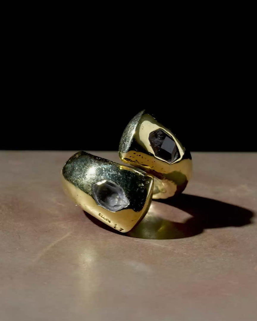 | Colors: | YG: Bright Gold. Brass substrate, polished and electroplated with 18k gold. HER: Herkimer diamond. Double-terminated quartz crystals, super clarity (water-clear) discovered within exposed outcrops of dolostone in and around Herkimer County, New York and the Mohawk River Valley [Anu-ra-el] |