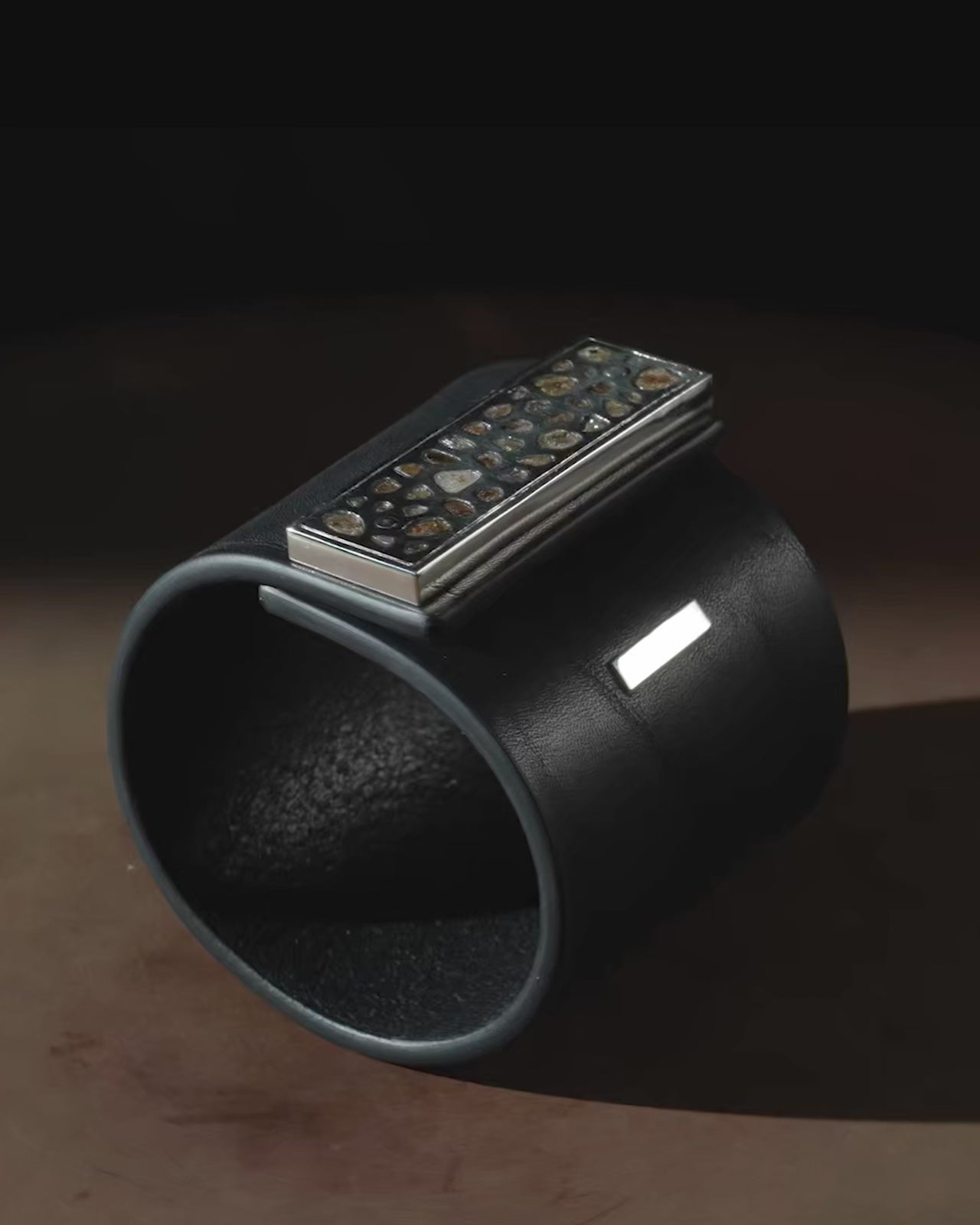 | Colors: | BLK: Black Buffalo leather. PA: Polished sterling silver. DIA: Rough Diamond. The stones used in this item are cuts of diamond material that are removed from a larger chunk of diamond as they are attempting to get to the perfect diamond in the center. Each stone fragment and shape are absolutely unique. |