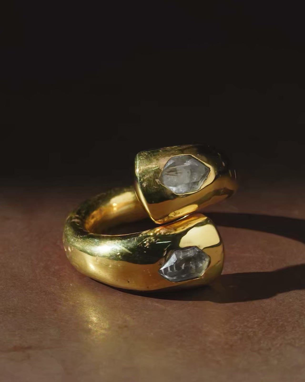 | Colors: | YG: Bright Gold. Brass substrate, polished and electroplated with 18k gold. HER: Herkimer diamond. Double-terminated quartz crystals, super clarity (water-clear) discovered within exposed outcrops of dolostone in and around Herkimer County, New York and the Mohawk River Valley [Anu-ra-el] |