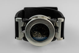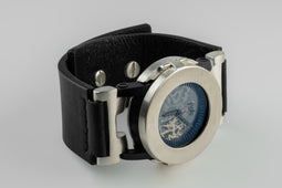 Avoid water and moisture whenever possible. While the watch body is water resistant to 5 atm, the watch band is constructed from leather and silver and will degrade from contact. Caution: Do not handle the crown upon contact with water.