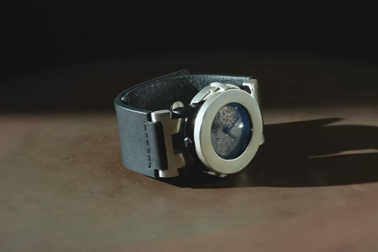Double layer open worked dial smoked mineral glass; stainless steel turbine blades, matte black.Glass