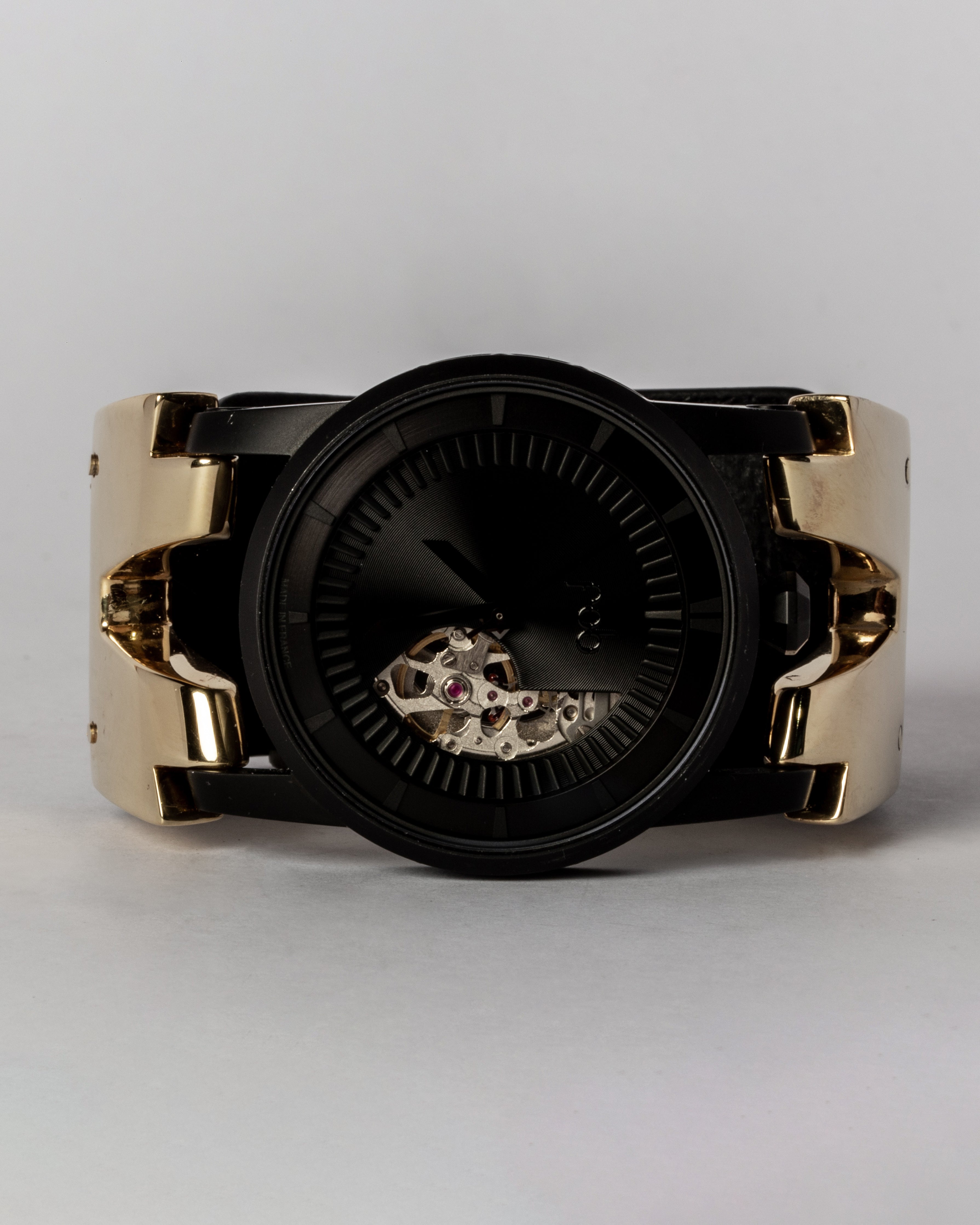 Double layer open worked dial smoked mineral glass; stainless steel turbine blades, matte black.Glass