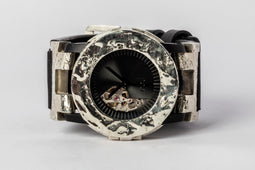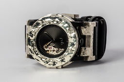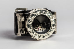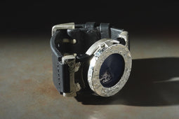 Avoid water and moisture whenever possible. While the watch body is water resistant to 5 atm, the watch band is constructed from leather and silver and will degrade from contact. Caution: Do not handle the crown upon contact with water.