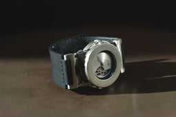 Avoid water and moisture whenever possible. While the watch body is water resistant to 5 atm, the watch band is constructed from leather and silver and will degrade from contact. Caution: Do not handle the crown upon contact with water.