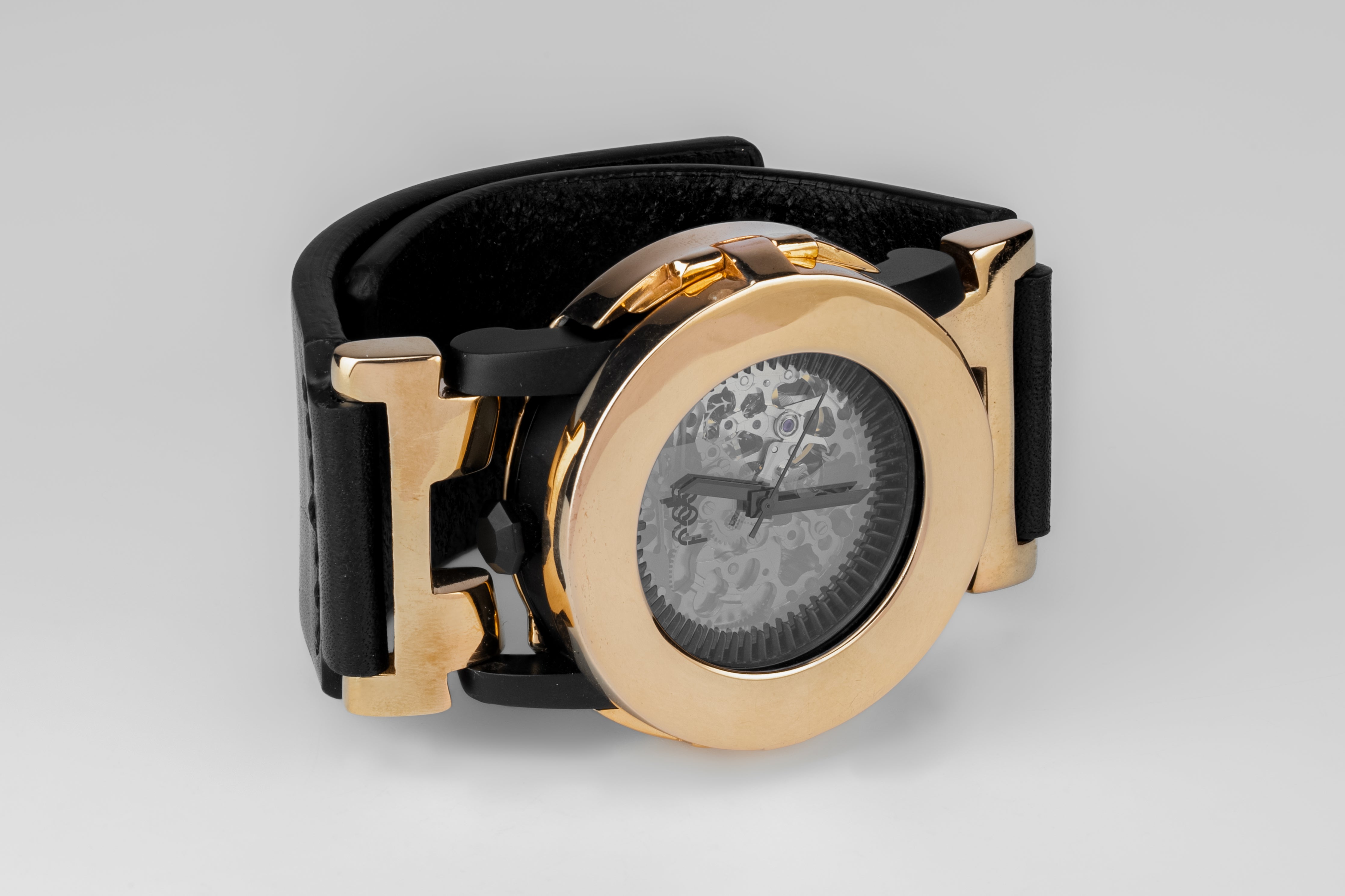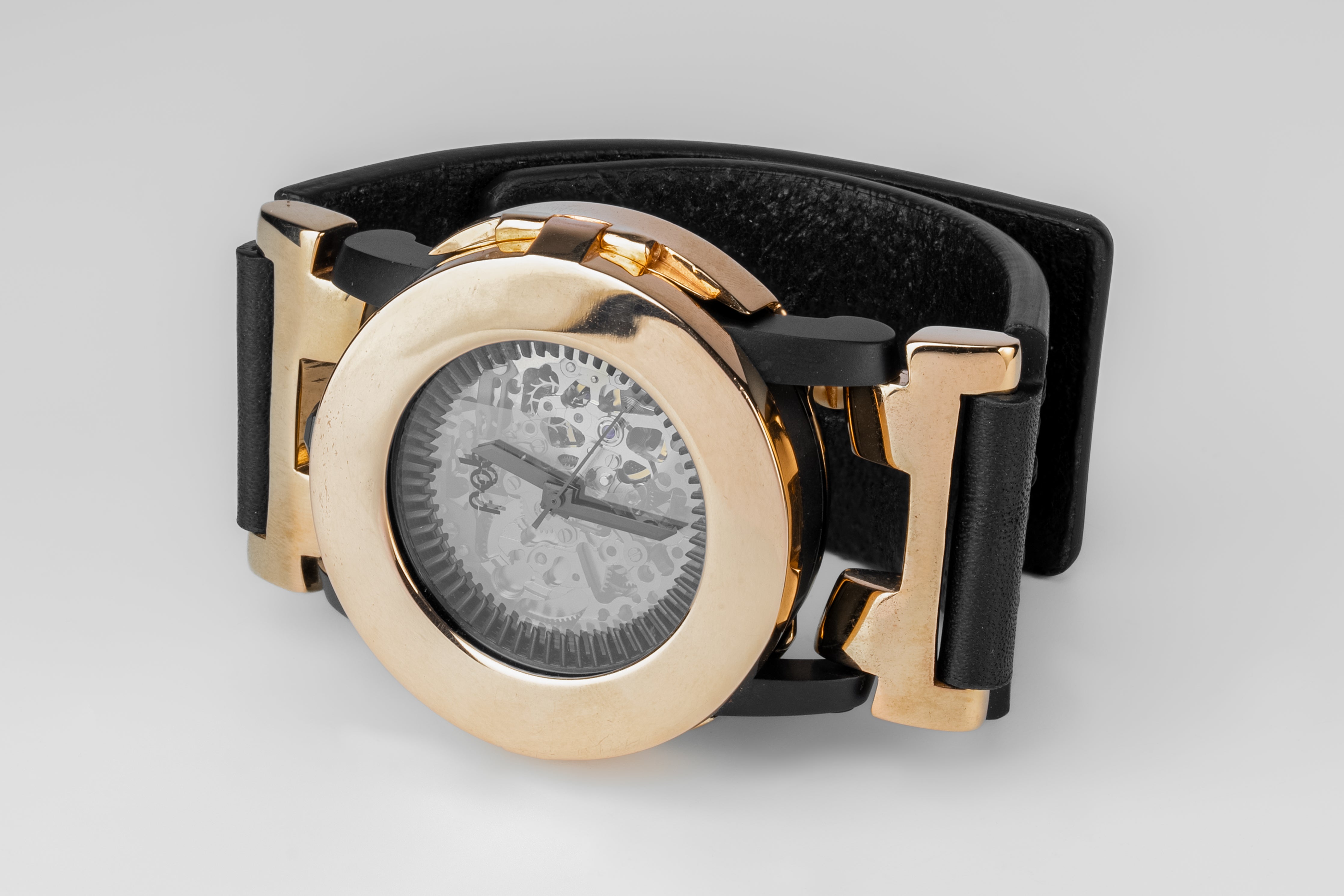 Double layer open worked dial smoked mineral glass; stainless steel turbine blades, matte black.Glass