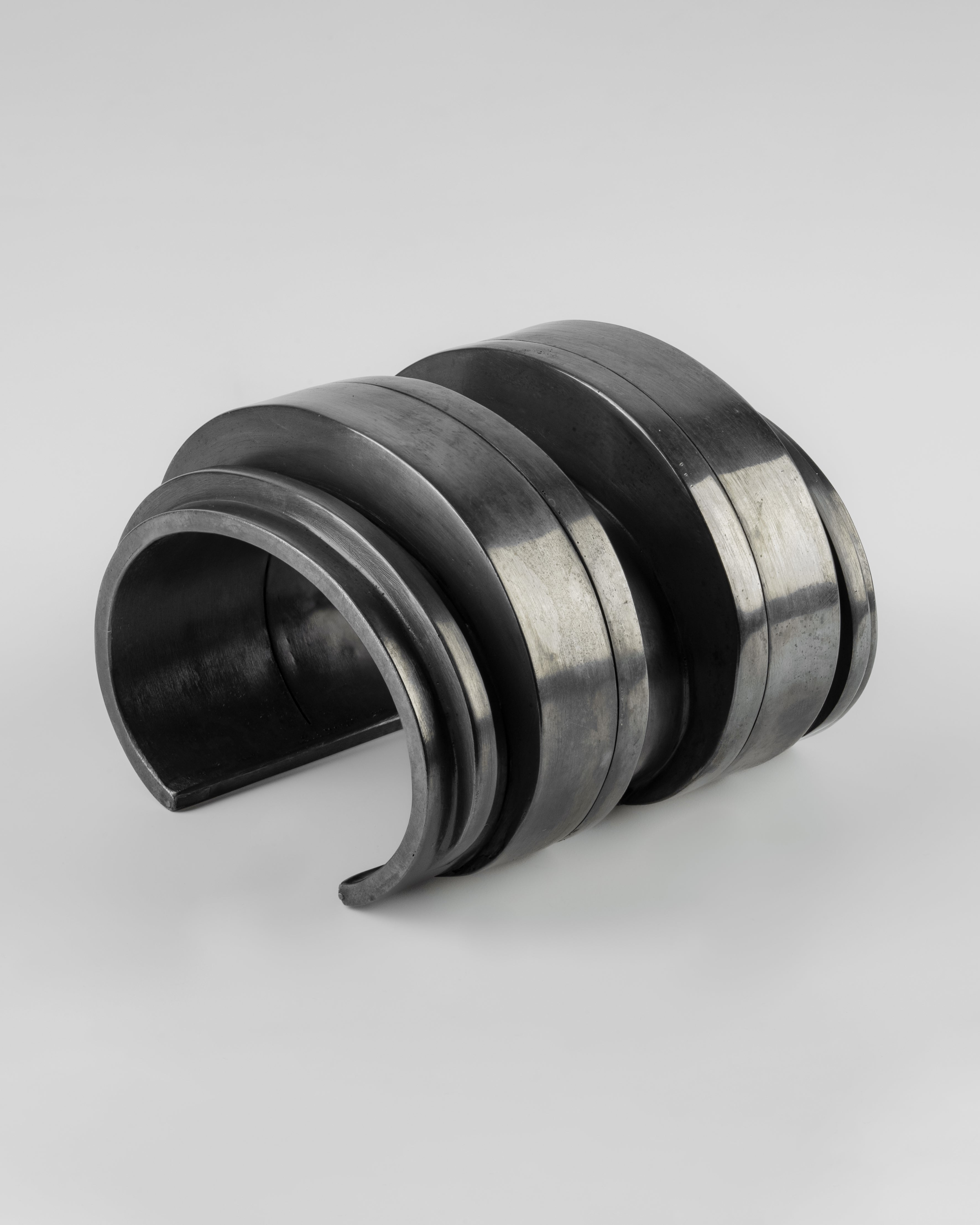 This piece is 100% hand fabricated from metal plate; cut into sections and soldered together to make the hollow three dimensional form. If sterling silver, the sheet metal is made by hand. The silver is melted and rolled out into plate.
