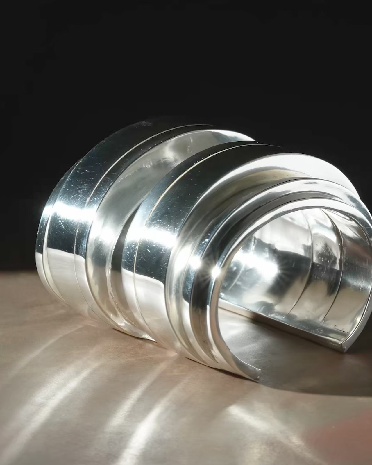This piece is 100% hand fabricated from metal plate; cut into sections and soldered together to make the hollow three dimensional form. If sterling silver, the sheet metal is made by hand. The silver is melted and rolled out into plate.