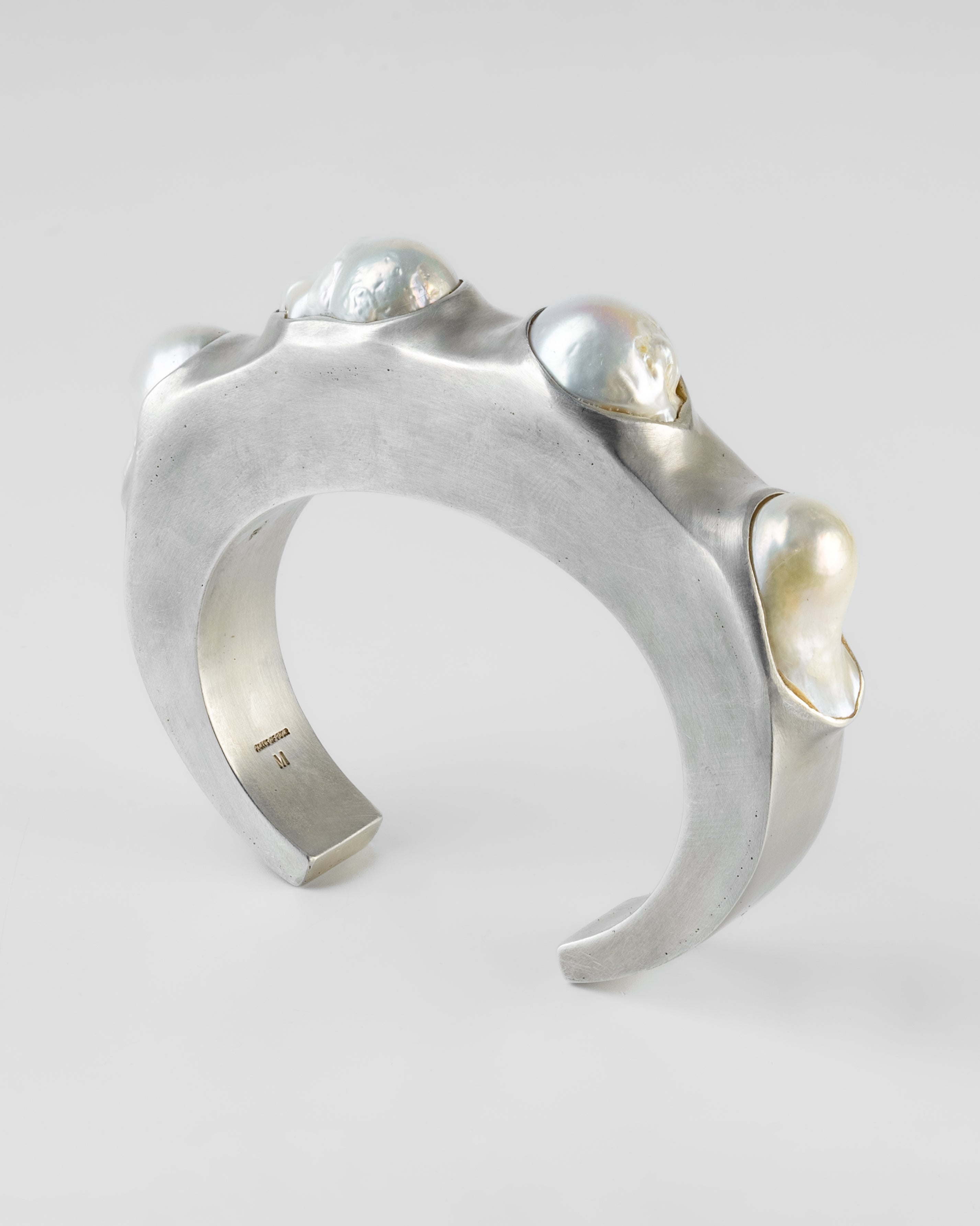 | Colors: | AS: Acid Silver. Brass substrate is electroplated with silver and then dipped into acid to create the subtly destroyed surface. The concentration of the plating solution, air temperature and time in the acid bath all play integral roles in the final result and exist in a delicate balance. No two items are the same and these nuances / variations should be seen as a characteristic of the product. MA: Matte Sterling Silver. Sanded at 320 grit WPRL: White Pearl. Baroque tear-dropped saltwater pearls. These are wild and natural bead specimens. |