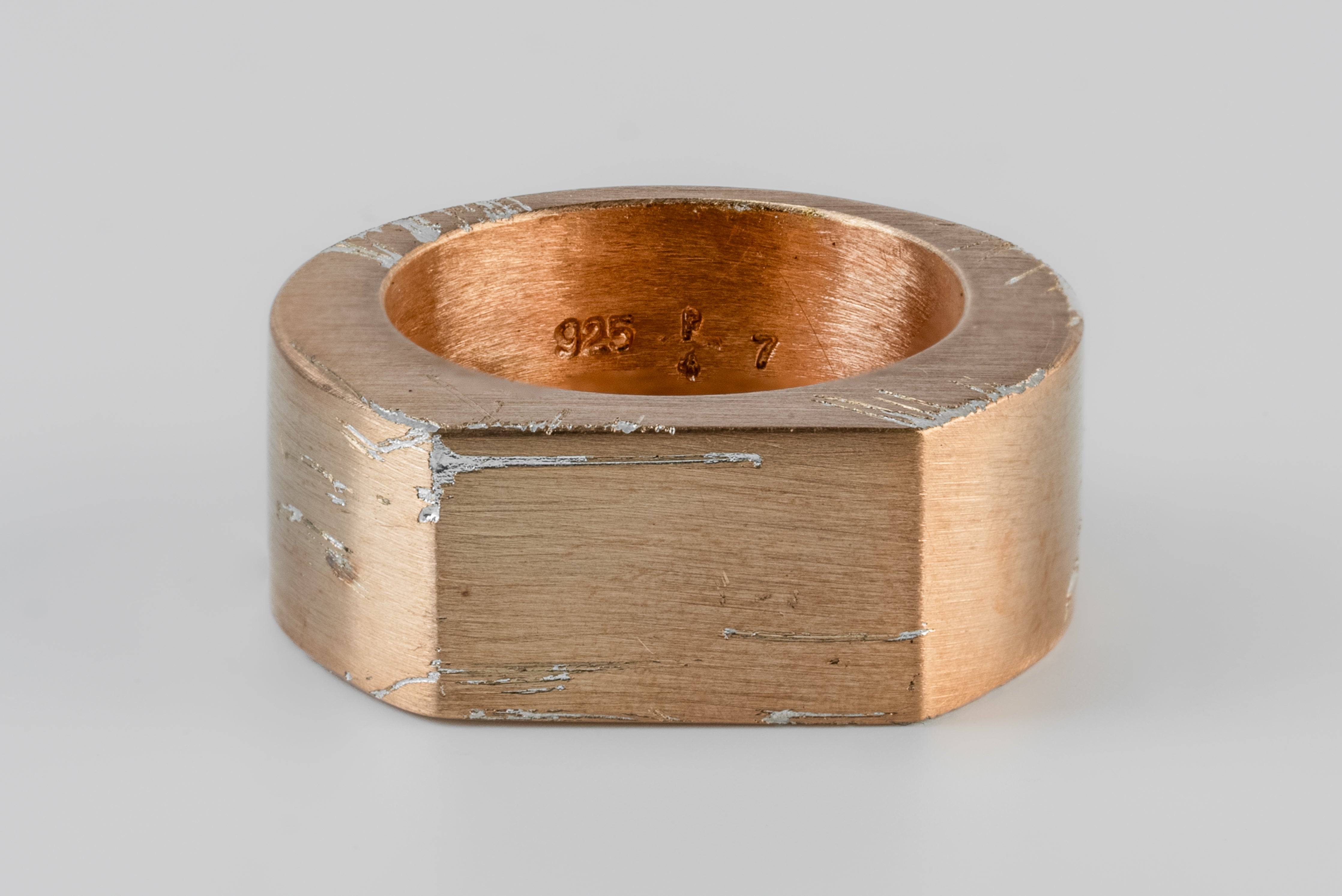 Colors: AMA: Sterling Acid Rose. Sterling silver substrate is electroplated with 18k Rose Gold and then dipped into acid to create the subtly destroyed surface. The concentration of the plating solution, air temperature and time in the acid bath all play integral roles in the final result and exist in a delicate balance. No two items are the same and these nuances / variations should be seen as a characteristic of the product.