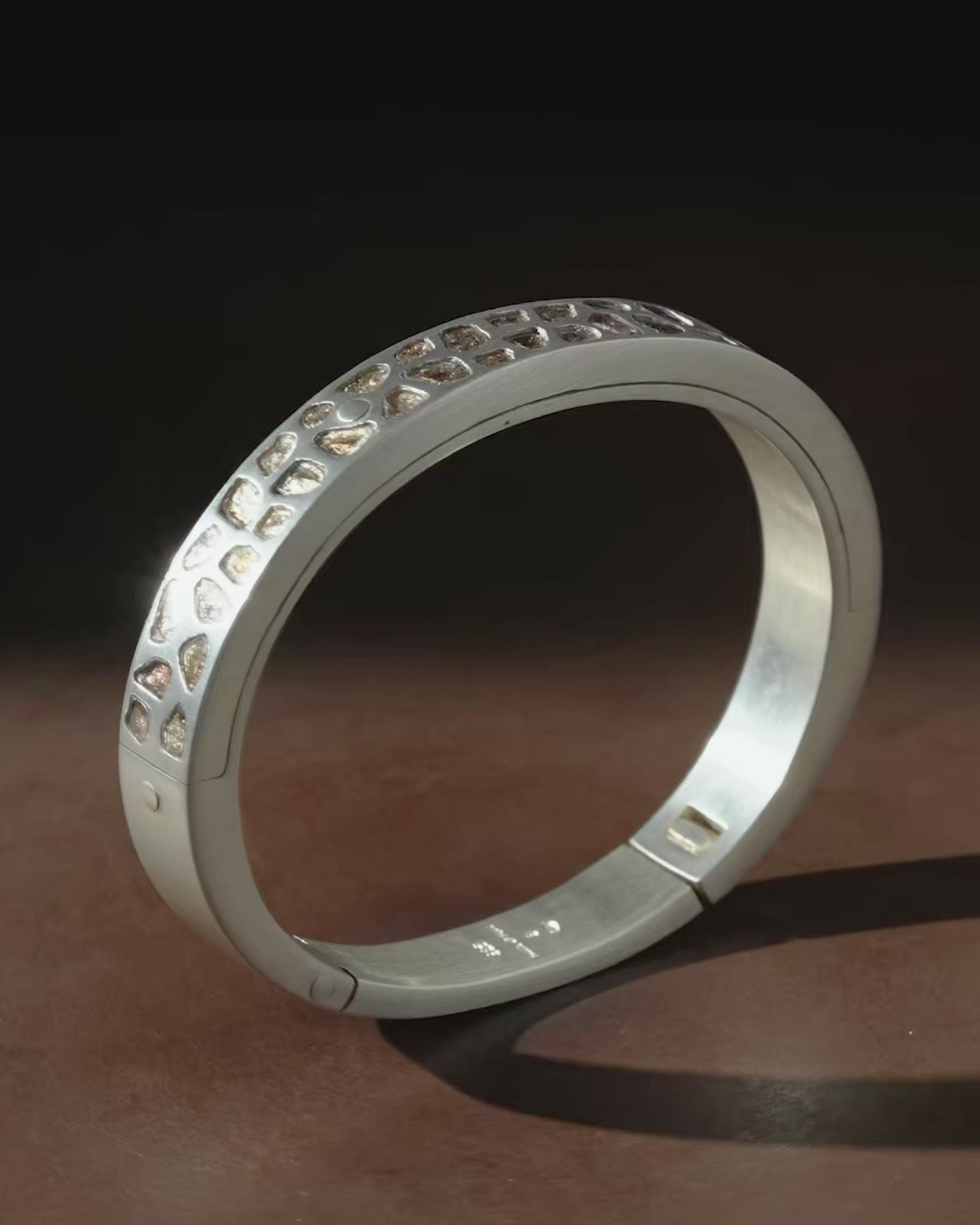 Mega Pavé is extreme stone setting. Breaking traditional norms, diamond slivers are individually carved into the wax master of every item before casting.