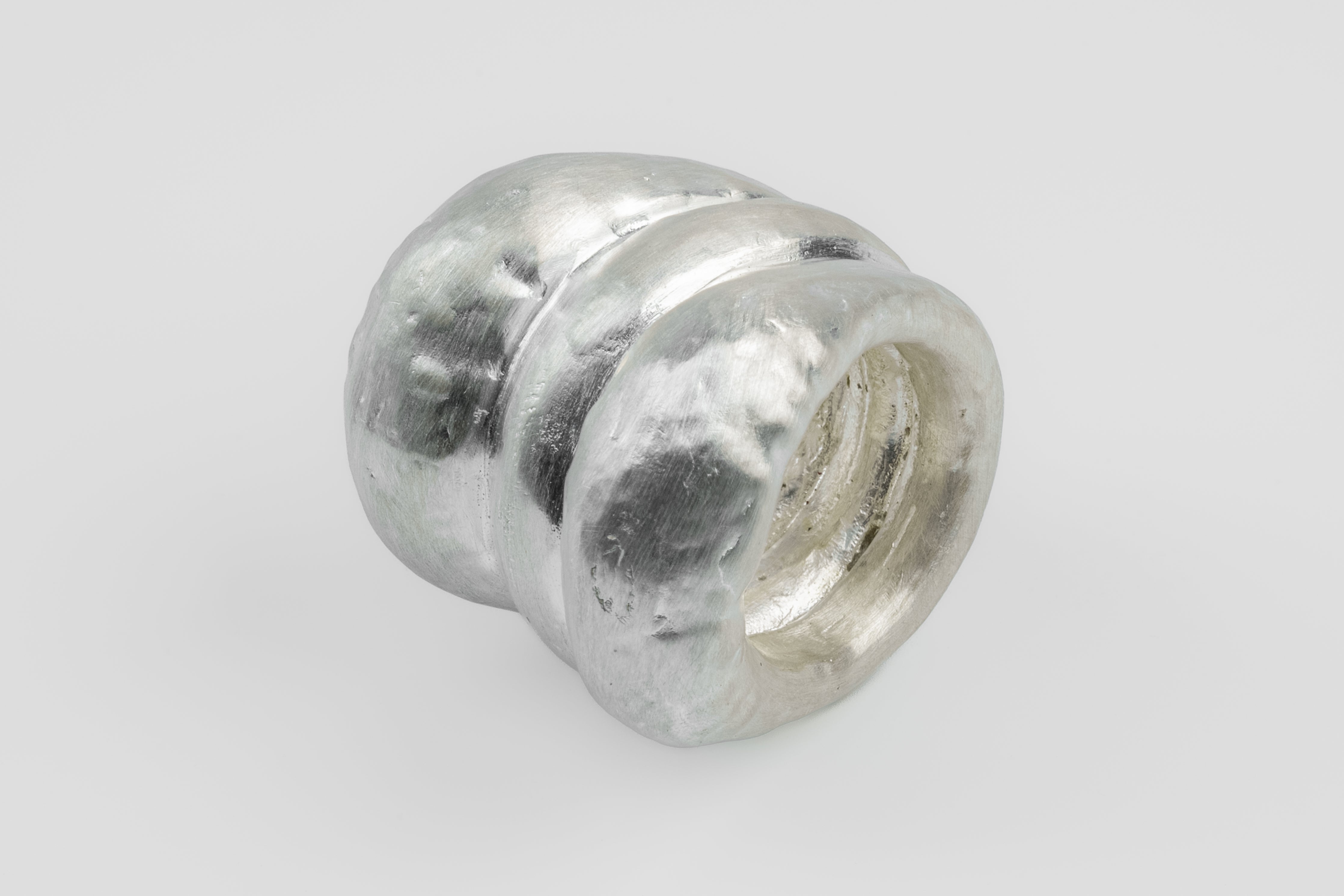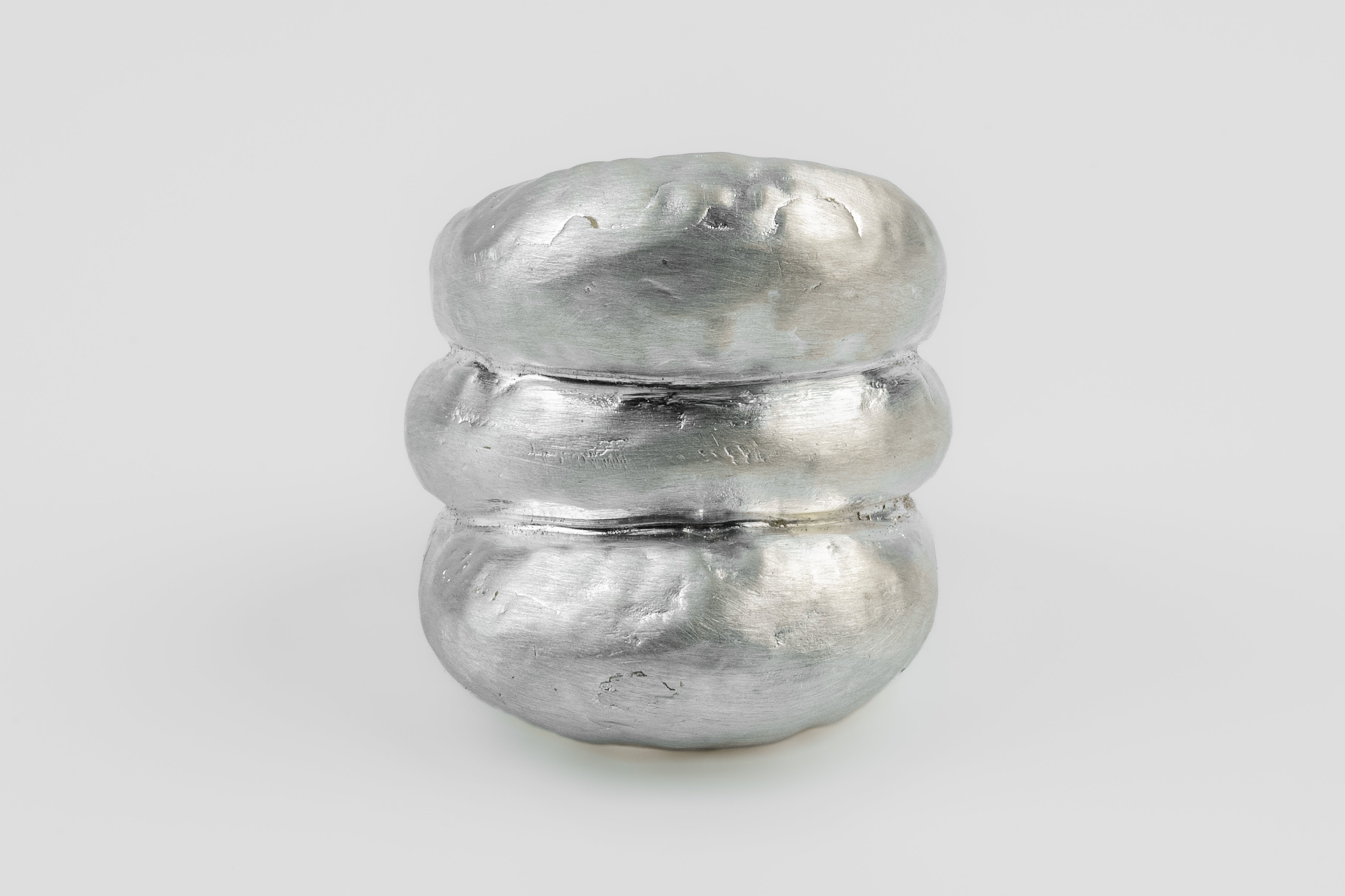 This piece is 100% hand fabricated from metal plate; cut into sections and soldered together to make the hollow three dimensional form. If sterling silver, the sheet metal is made by hand. The silver is melted and rolled out into plate.