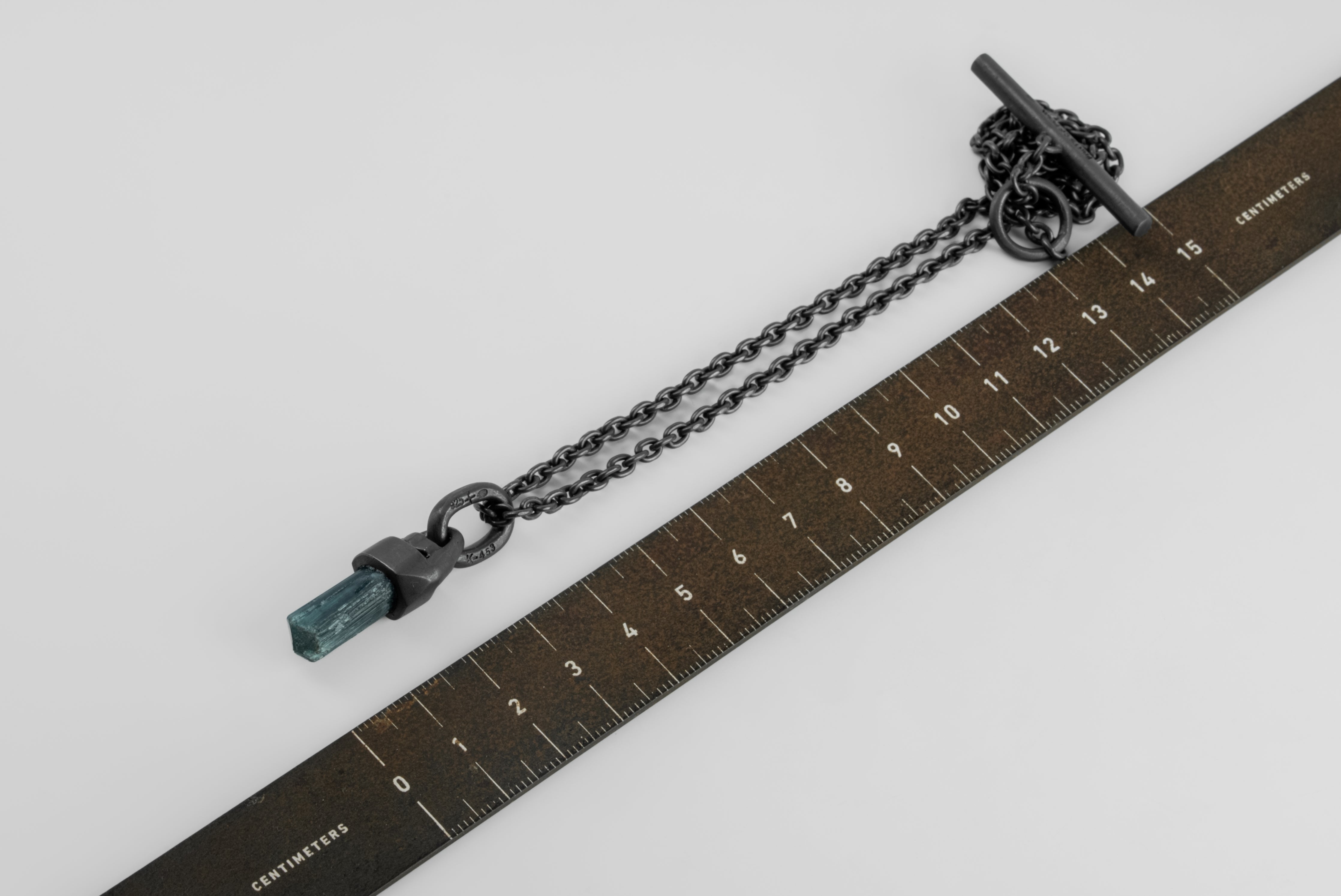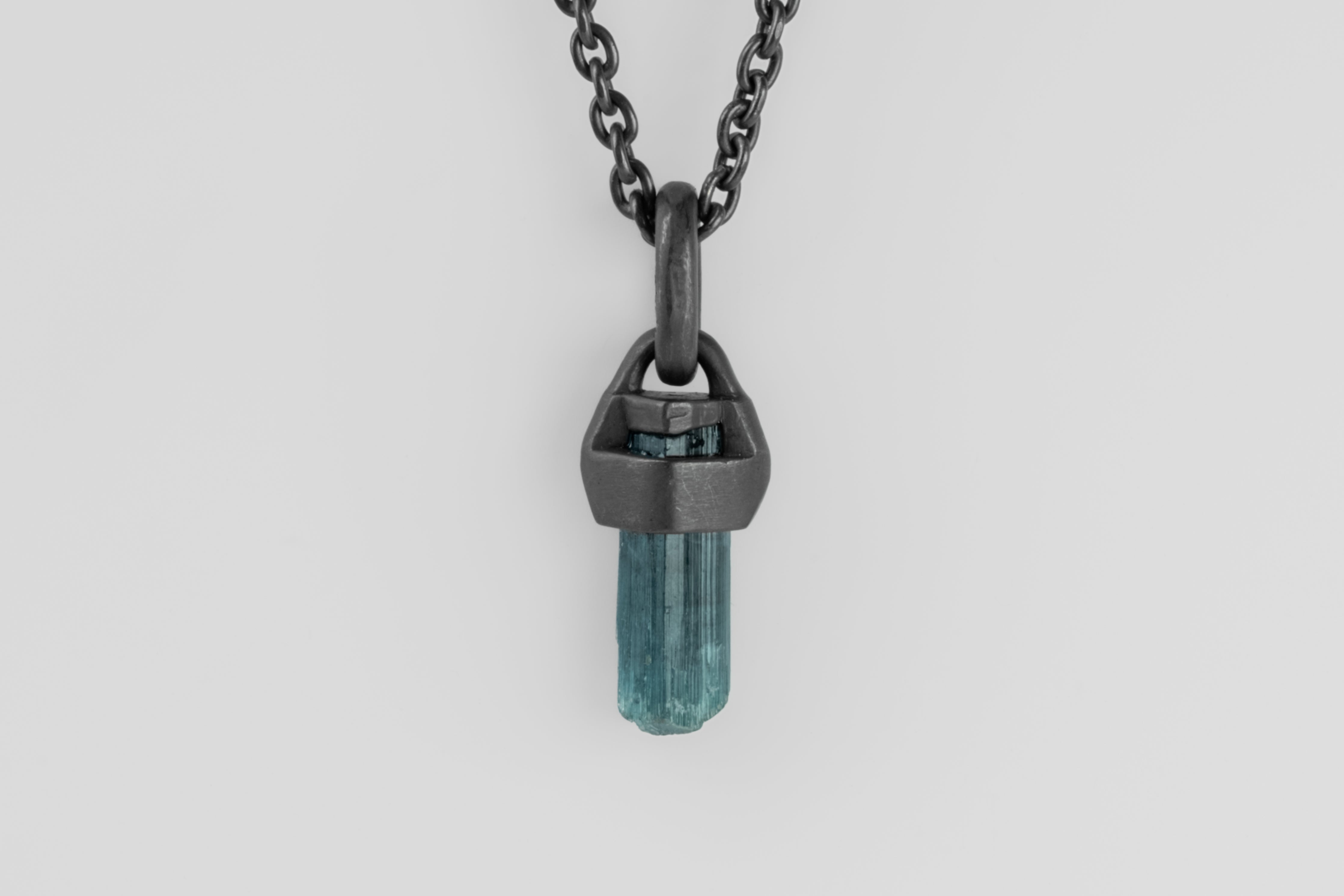 | Colors: | KA: Black Sterling. Black Sterling is a surface oxidation of sterling silver. This finish may fade over time, which can be considered an enhancement. Please note that Black Sterling tends to appear darker in photograph than in person. The finish can be re-blackened easily with Liver of Sulfur, available at most jewelry suppliers. BCT: Blue Cap Tourmaline. Locality: Mwajanga |
