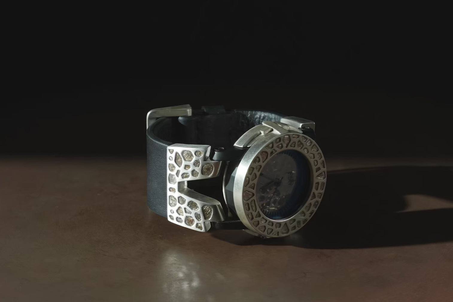 | Colors: | MA: Matte Sterling Silver. Sanded at 320 grit DIA: Rough Diamond. The stones used in this item are cuts of diamond material that are removed from a larger chunk of diamond as they are attempting to get to the perfect diamond in the center. Each stone fragment and shape are absolutely unique. NG: Nero Grappone Leather. |