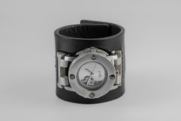 Avoid water and moisture whenever possible. While the watch body is water resistant to 5 atm, the watch band is constructed from leather and silver and will degrade from contact. Caution: Do not handle the crown upon contact with water.
