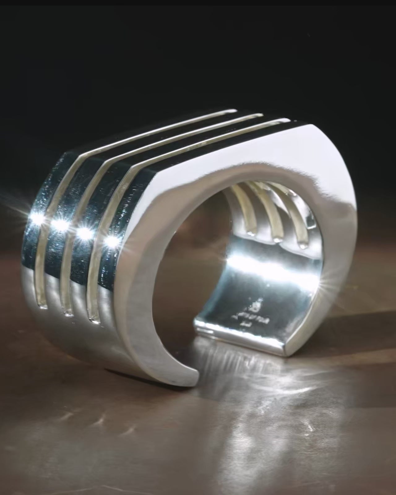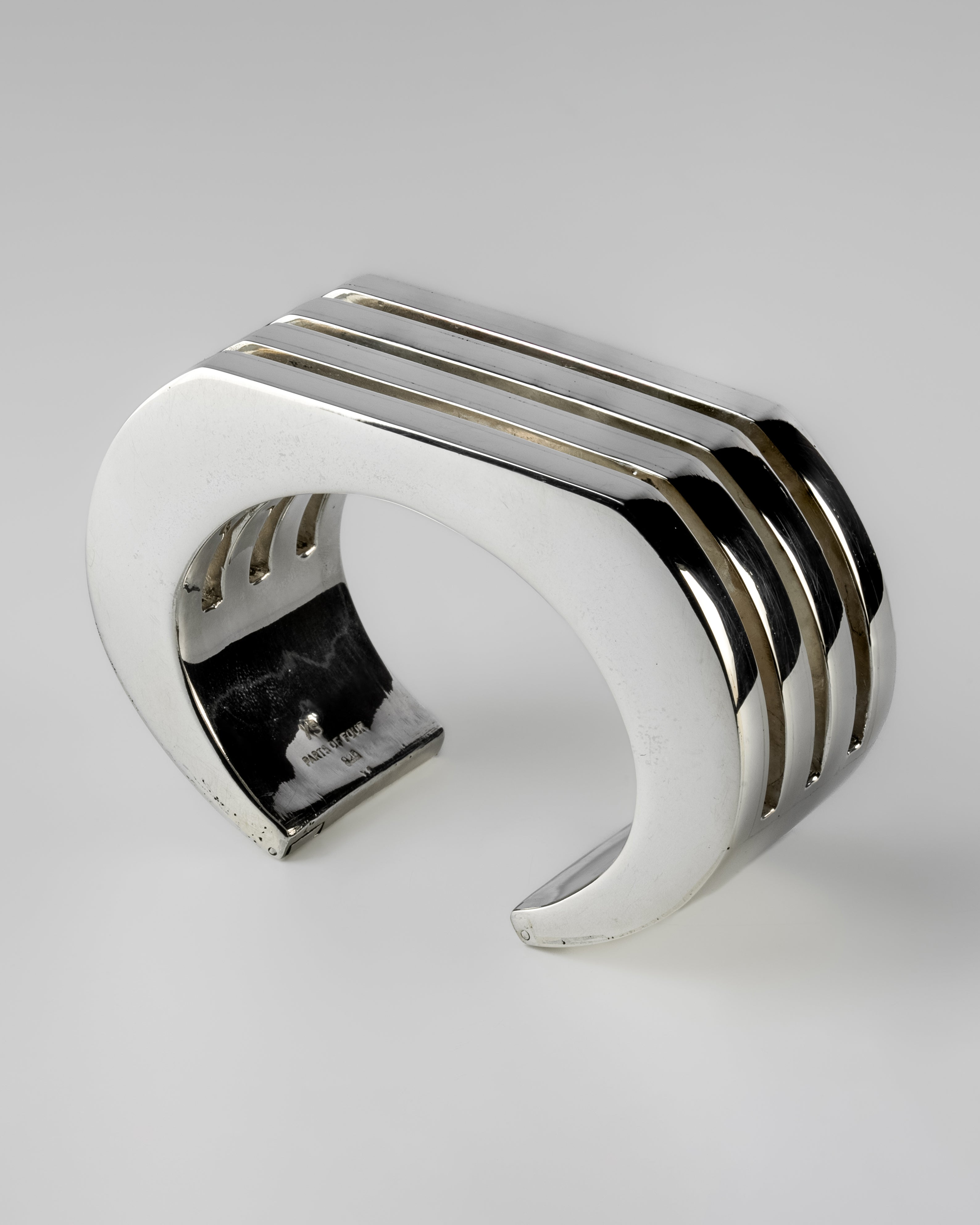 This piece is 100% hand fabricated from metal plate; cut into sections and soldered together to make the hollow three dimensional form. If sterling silver, the sheet metal is made by hand. The silver is melted and rolled out into plate.