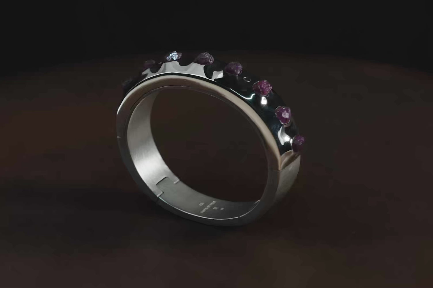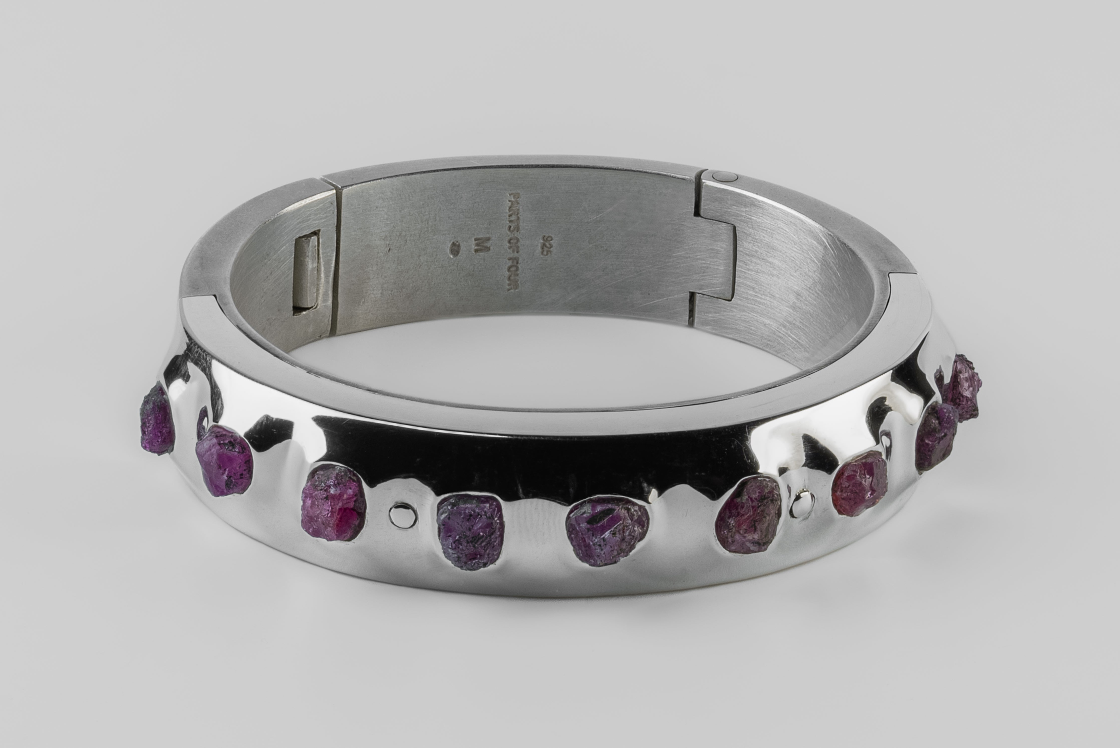 | Colors: | DA: Dirty Sterling. Sterling silver, dipped in acid to create a subdued surface. Results will never be identical, and this nuance / variation should be seen as a characteristic of the uniqueness of the product. PA: Polished sterling silver. DRUS: Dirty Ruby Slabs. Slabs of rough harvested ruby, excavation quality. Un-polished. |