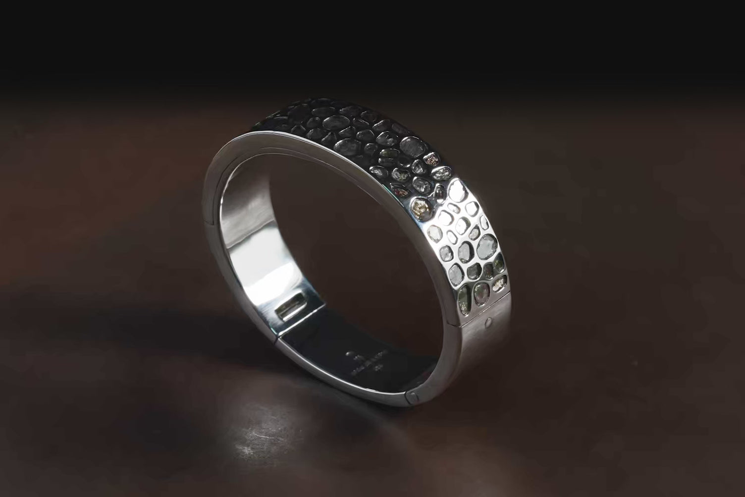 Mega Pavé is extreme stone setting. Breaking traditional norms, diamond slivers are individually carved into the wax master of every item before casting.
