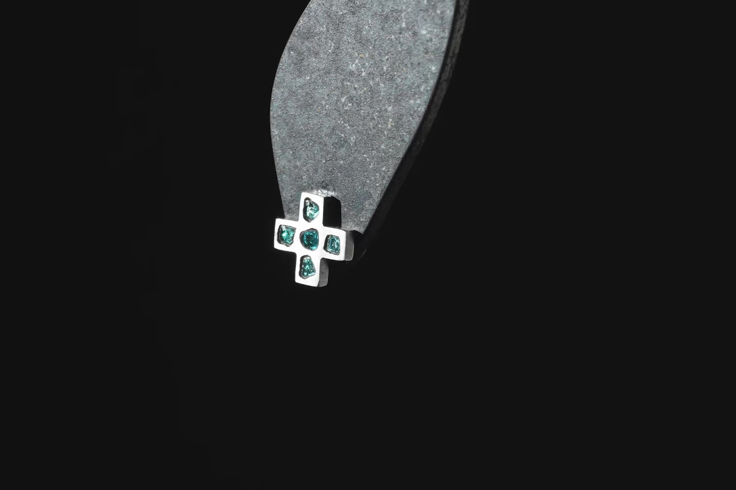 Mega Pavé is extreme stone setting. Breaking traditional norms, diamond slivers are individually carved into the wax master of every item before casting.