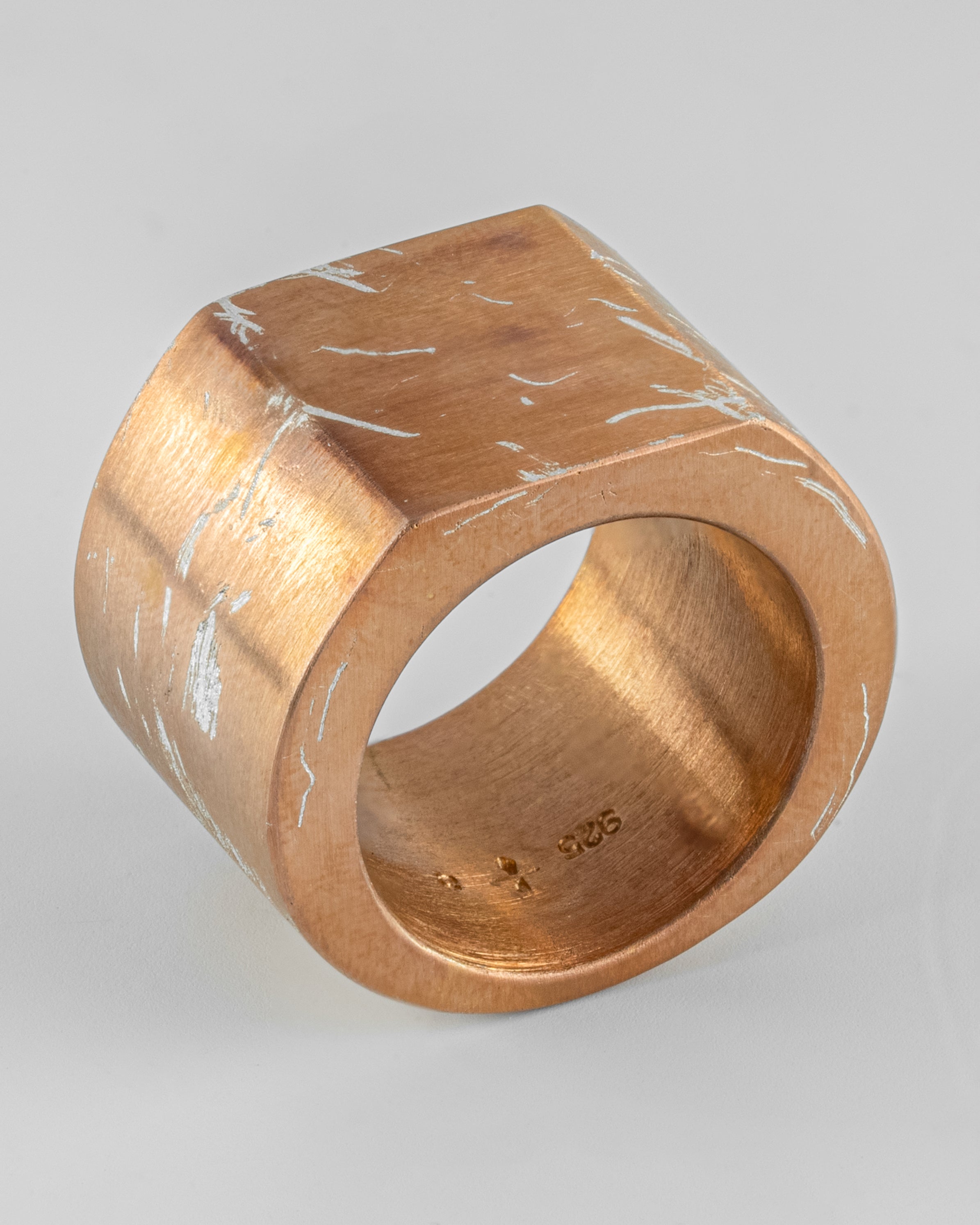 | Colors: | AMA: Sterling Acid Rose. Sterling silver substrate is electroplated with 18k Rose Gold and then dipped into acid to create the subtly destroyed surface. The concentration of the plating solution, air temperature and time in the acid bath all play integral roles in the final result and exist in a delicate balance. No two items are the same and these nuances / variations should be seen as a characteristic of the product. |