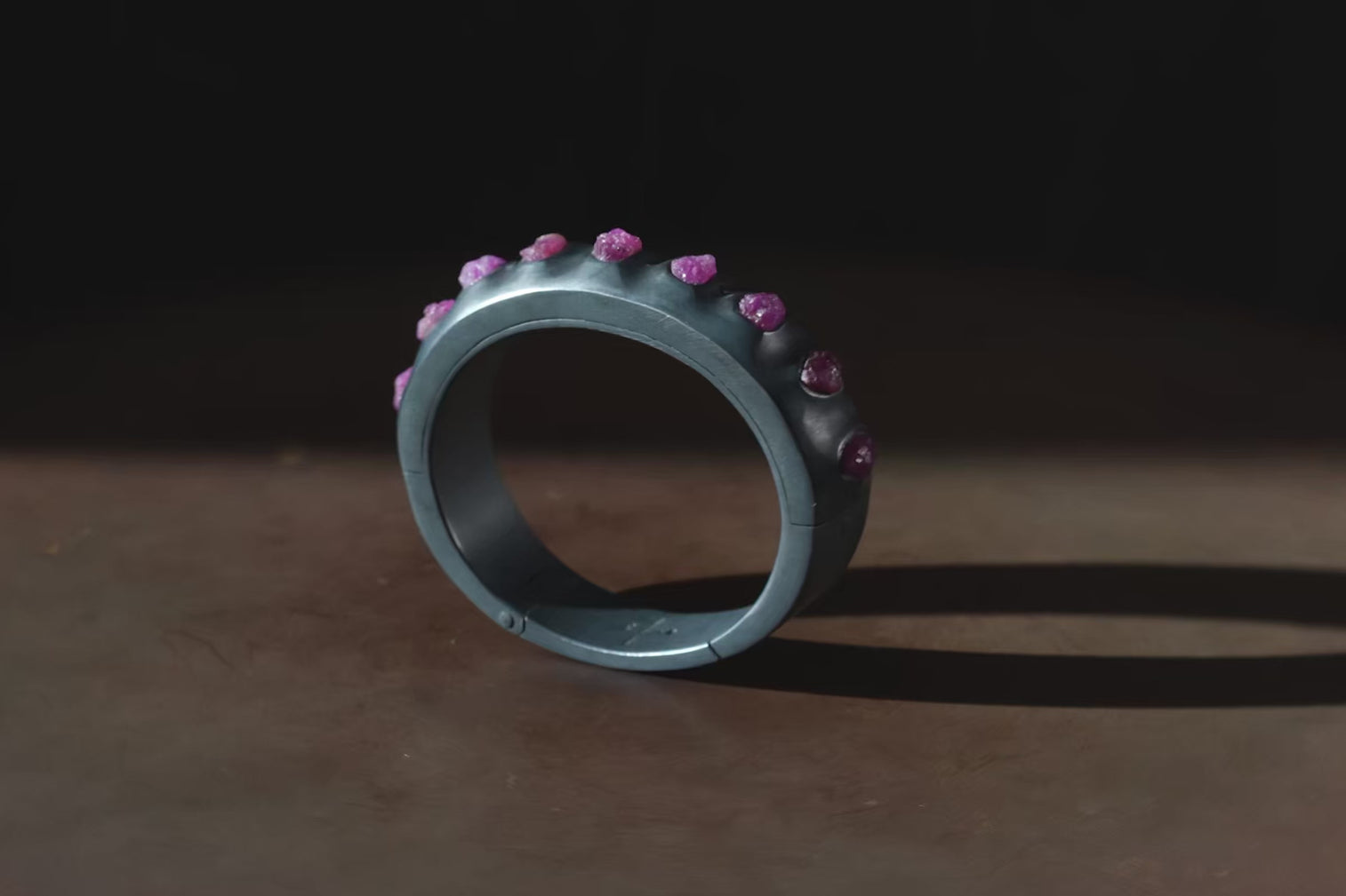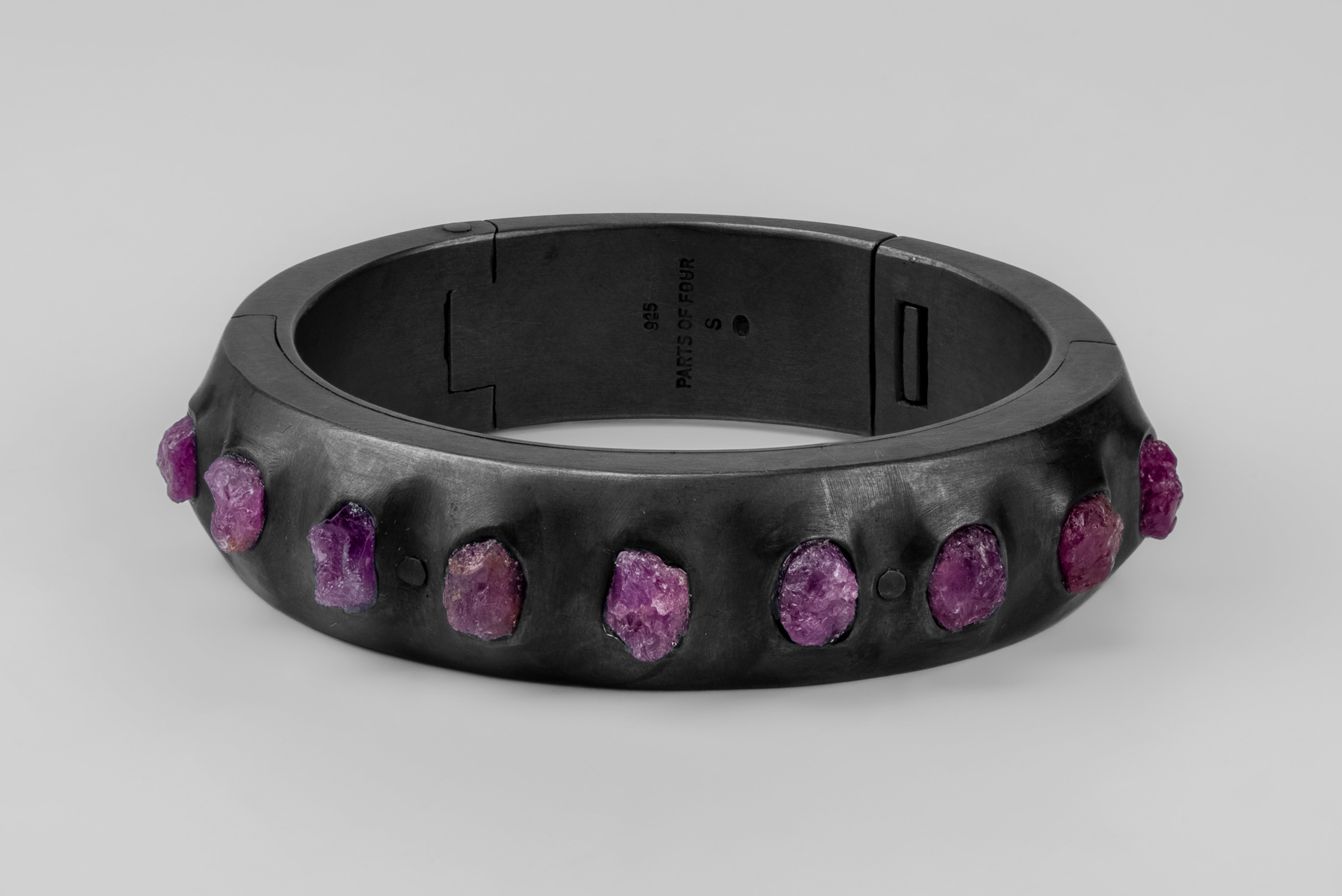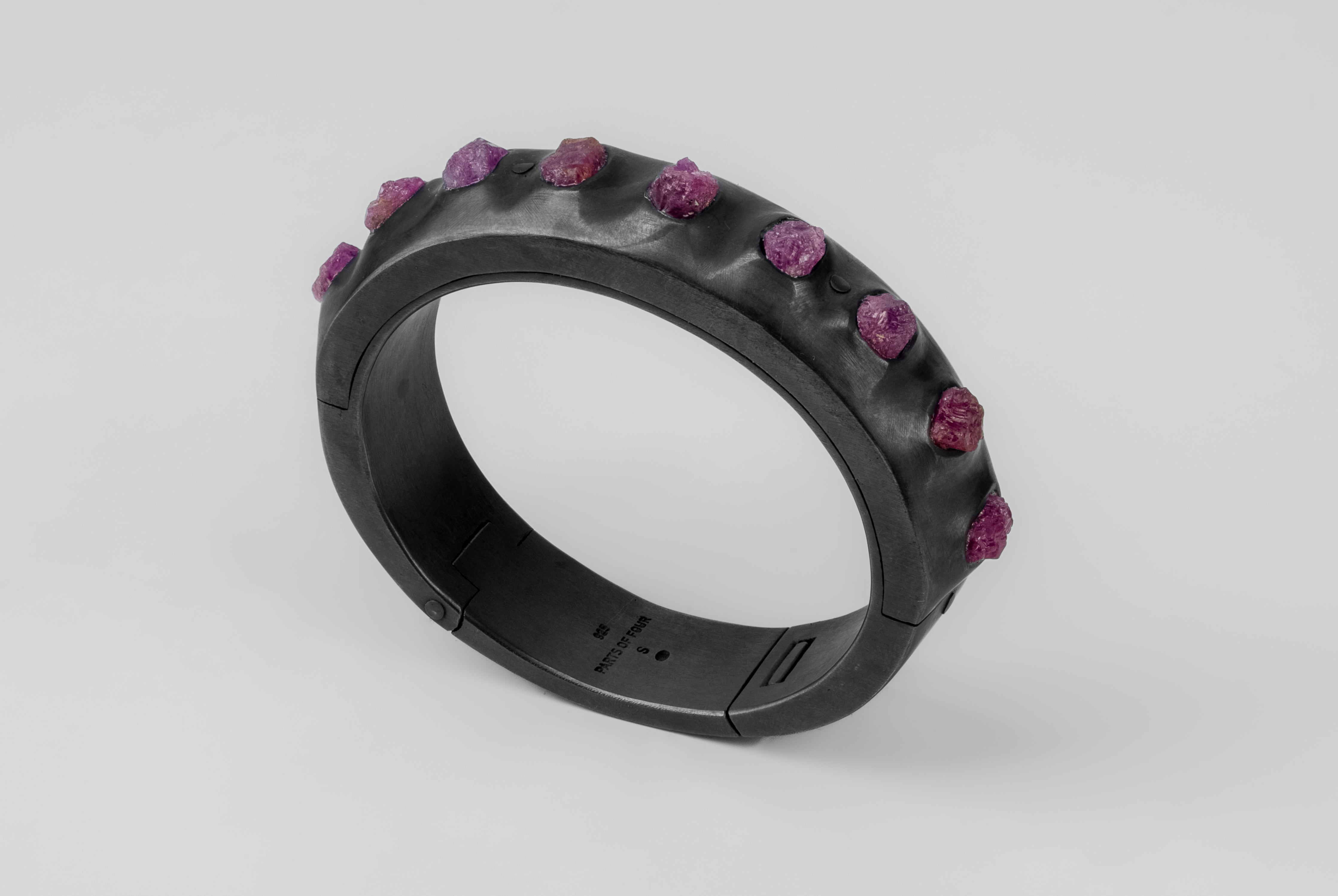 | Colors: | KA: Black Sterling. Black Sterling is a surface oxidation of sterling silver. This finish may fade over time, which can be considered an enhancement. Please note that Black Sterling tends to appear darker in photograph than in person. The finish can be re-blackened easily with Liver of Sulfur, available at most jewelry suppliers. DRUS: Dirty Ruby Slabs. Slabs of rough harvested ruby, excavation quality. Un-polished. |