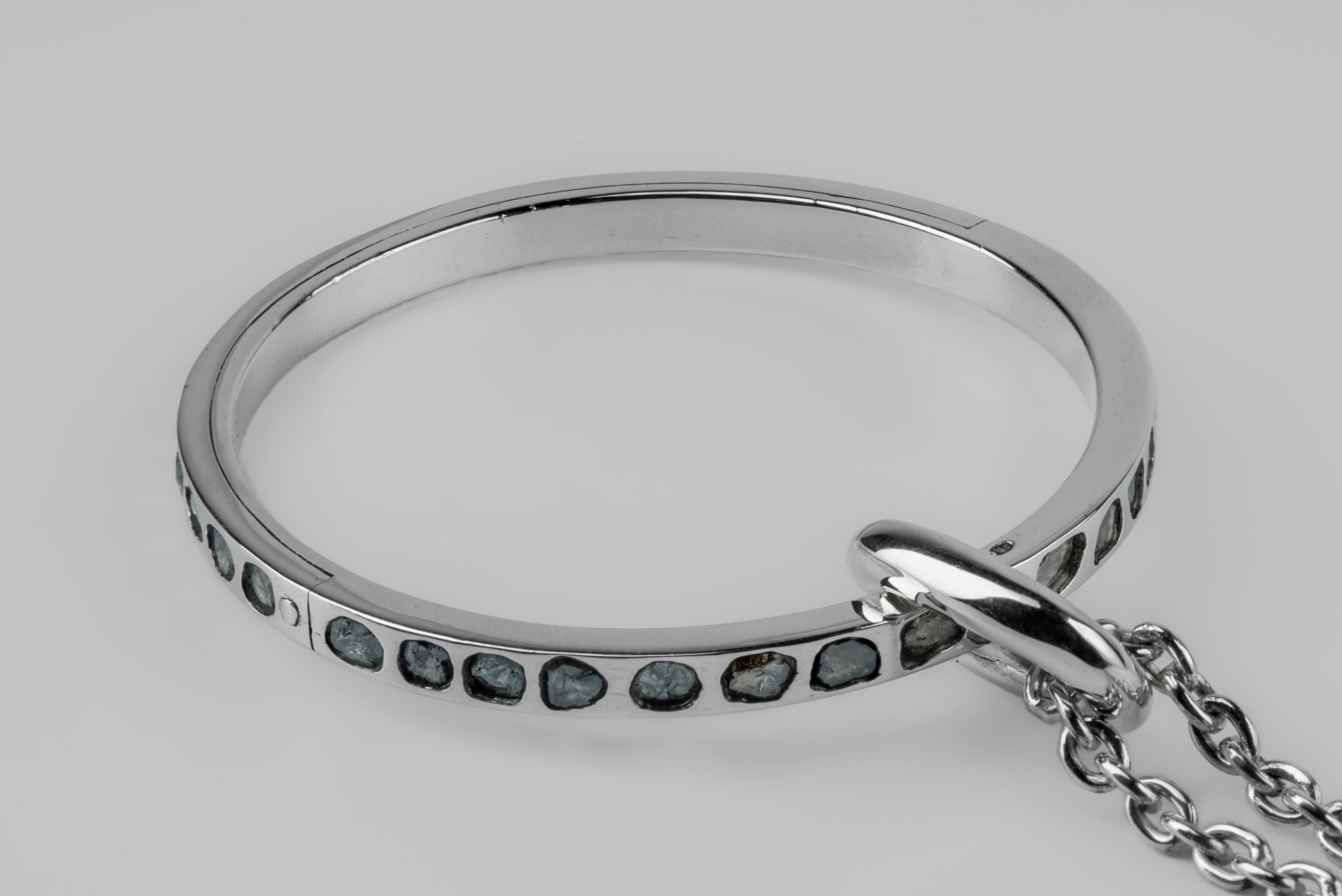 | Colors: | PA: Polished sterling silver. DIA: Rough Diamond. The stones used in this item are cuts of diamond material that are removed from a larger chunk of diamond as they are attempting to get to the perfect diamond in the center. Each stone fragment and shape are absolutely unique. |