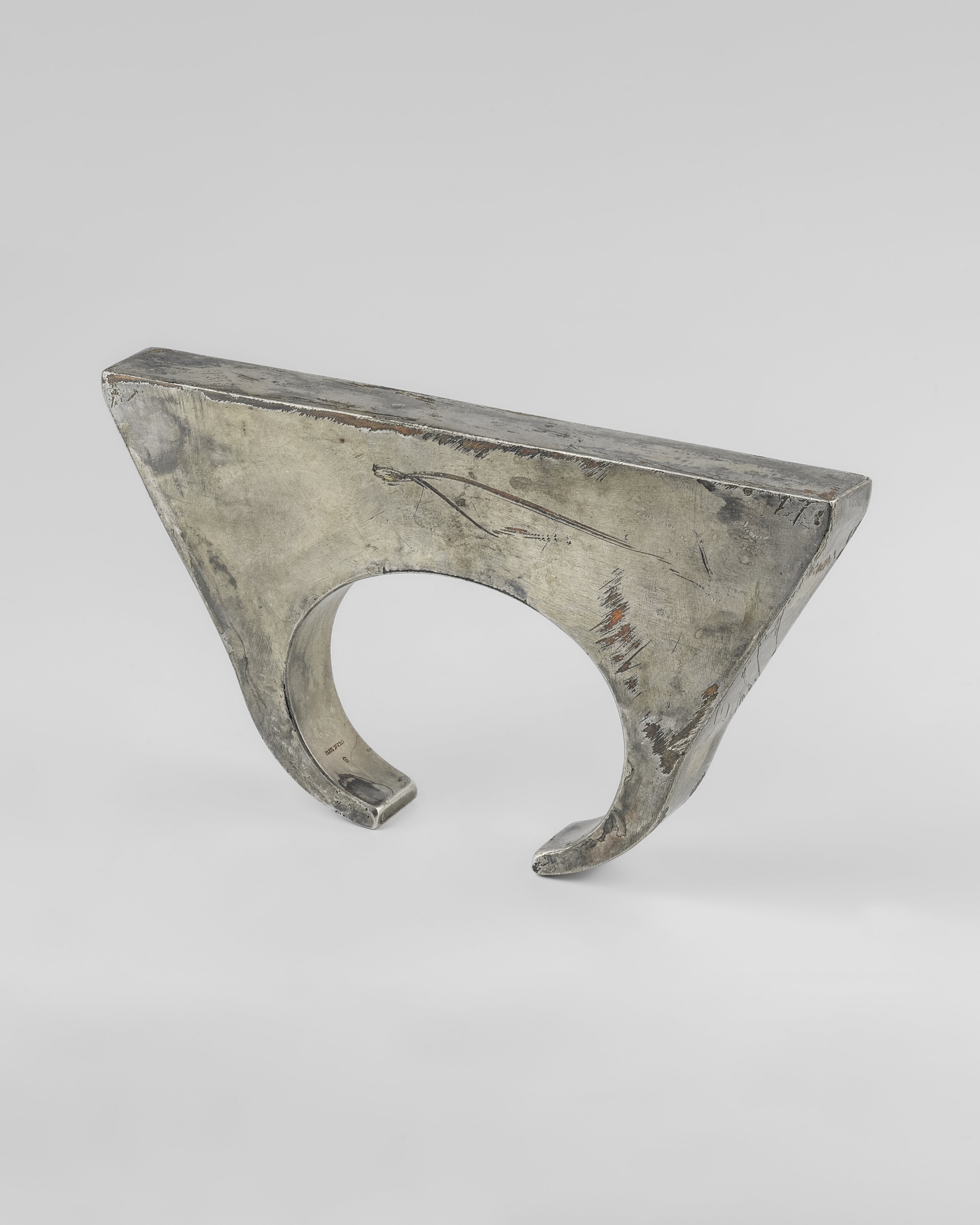 This piece is 100% hand fabricated from metal plate; cut into sections and soldered together to make the hollow three dimensional form. If sterling silver, the sheet metal is made by hand. The silver is melted and rolled out into plate.