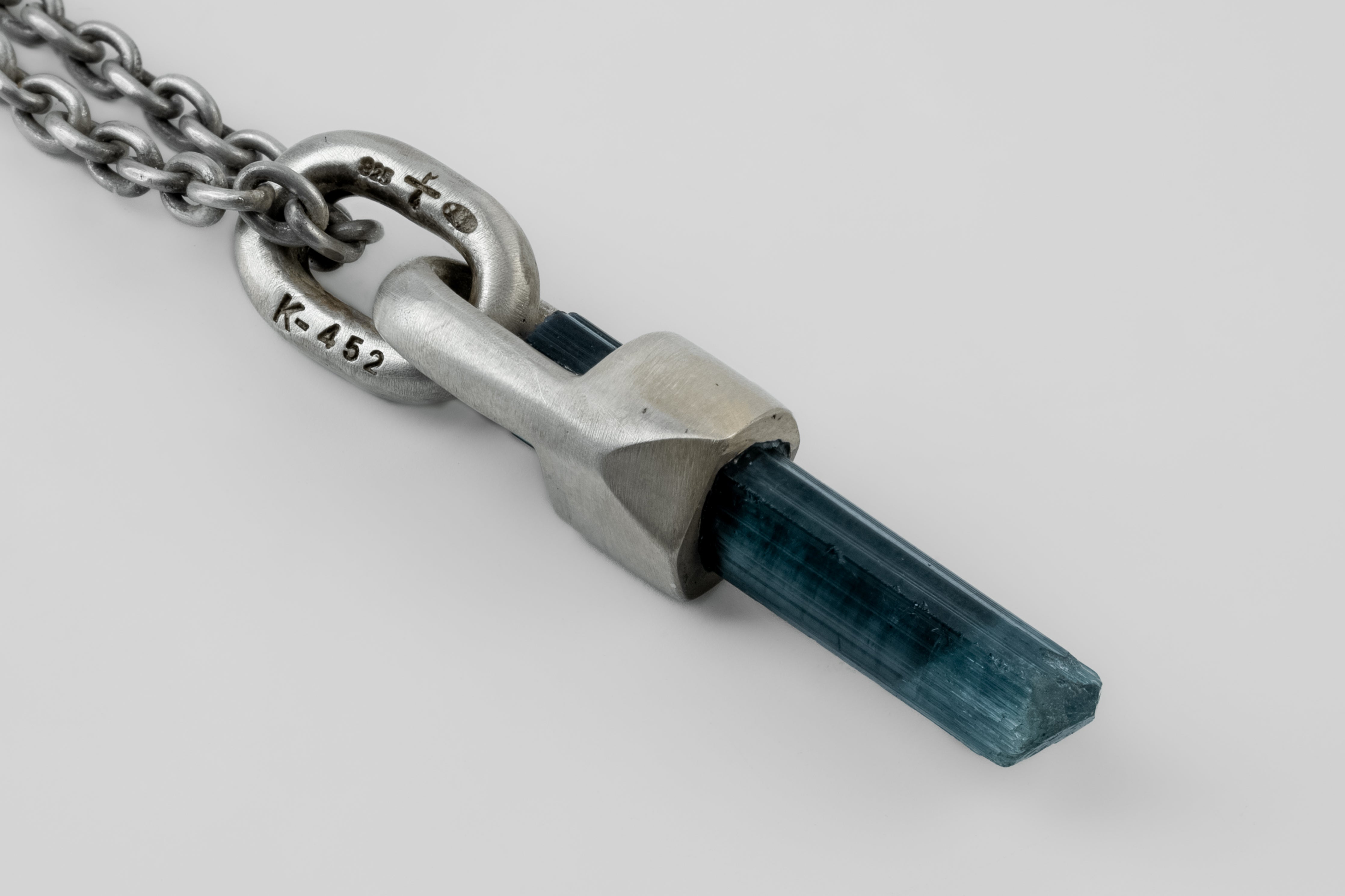 | Colors: | DA: Dirty Sterling. Sterling silver, dipped in acid to create a subdued surface. Results will never be identical, and this nuance / variation should be seen as a characteristic of the uniqueness of the product. BCT: Blue Cap Tourmaline. Locality: Mwajanga |