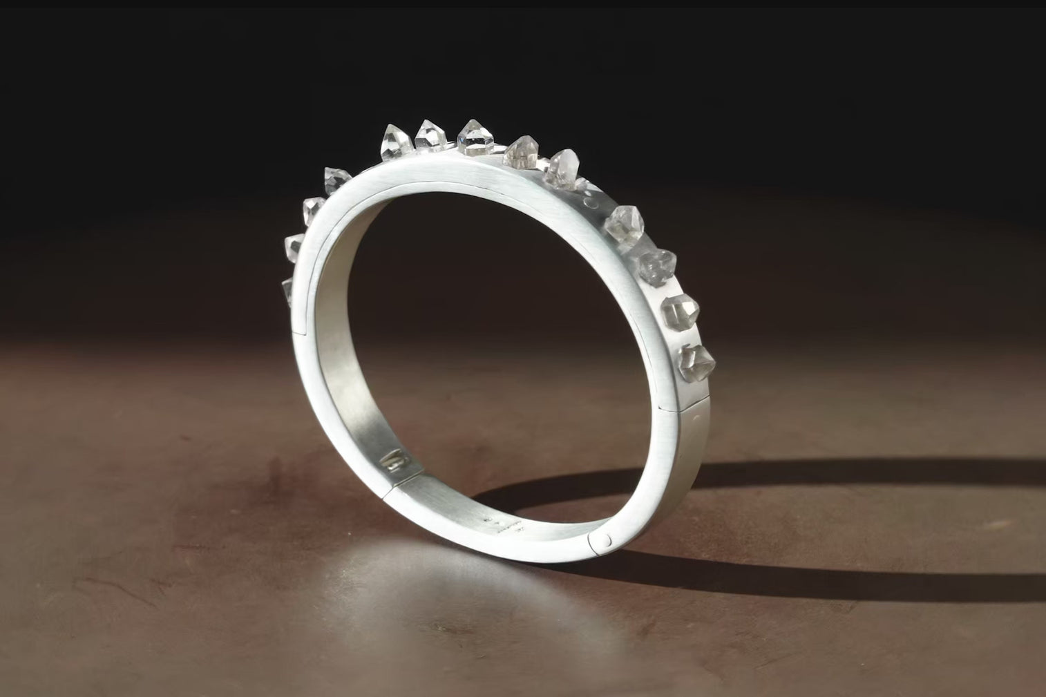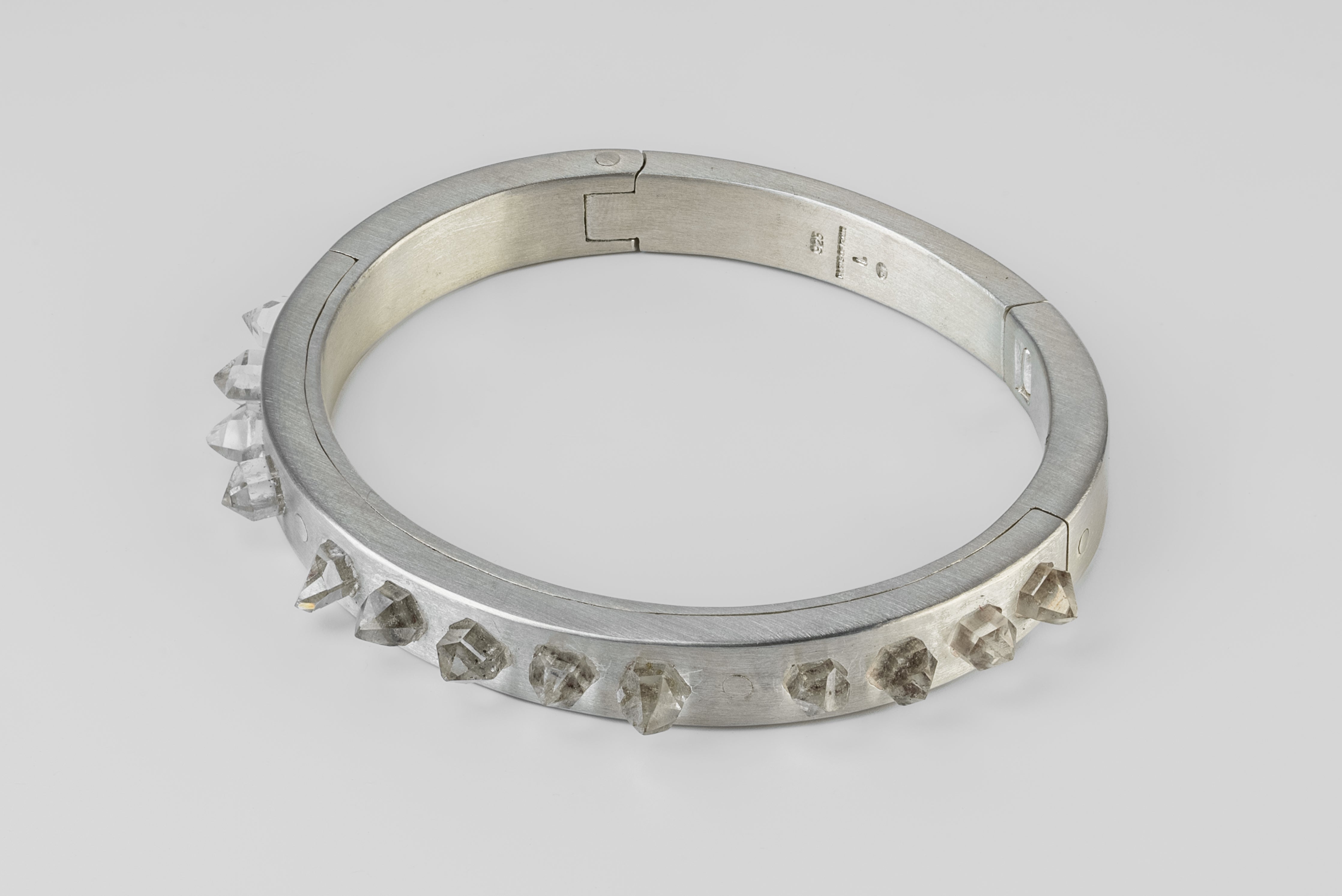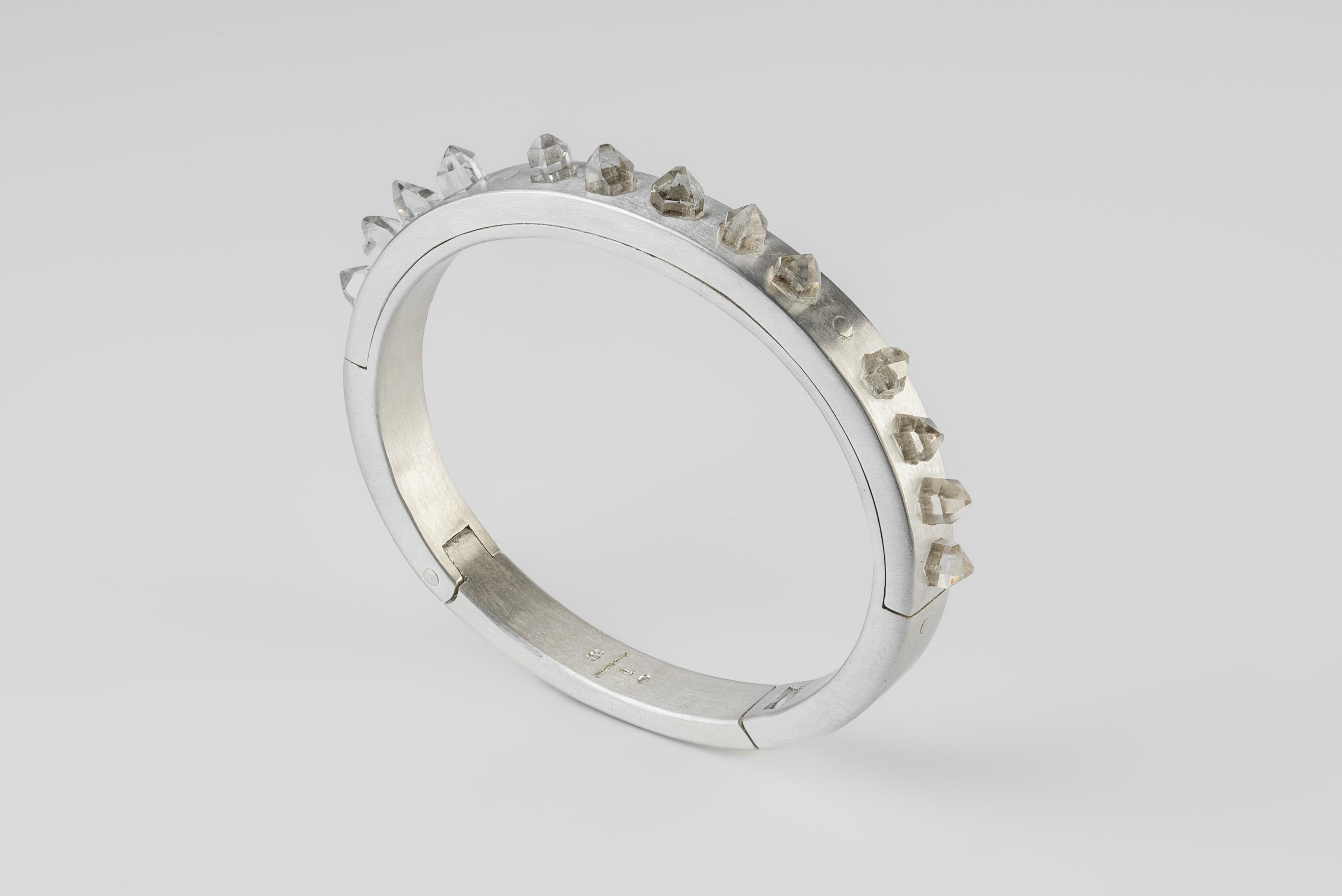 | Colors: | MA: Matte Sterling Silver. Sanded at 320 grit HER: Herkimer diamond. Double-terminated quartz crystals, super clarity (water-clear) discovered within exposed outcrops of dolostone in and around Herkimer County, New York and the Mohawk River Valley [Anu-ra-el] |
