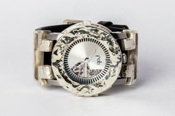 Avoid water and moisture whenever possible. While the watch body is water resistant to 5 atm, the watch band is constructed from leather and silver and will degrade from contact. Caution: Do not handle the crown upon contact with water.