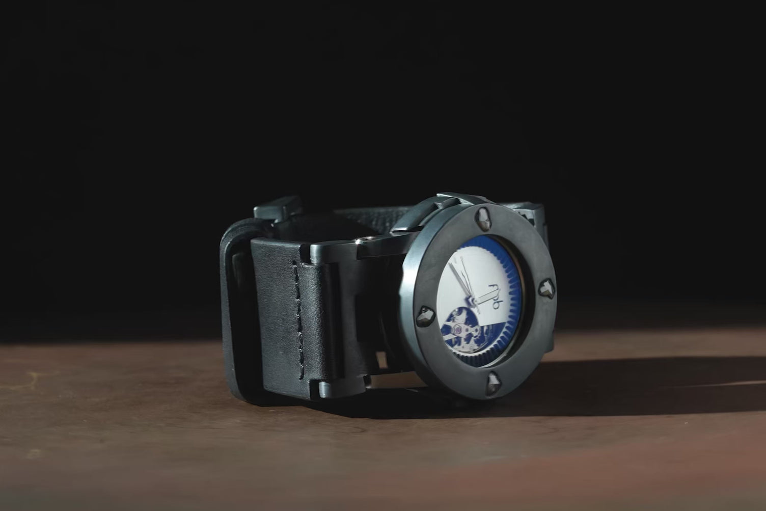 Double layer open worked dial smoked mineral glass; stainless steel turbine blades, matte black.Glass