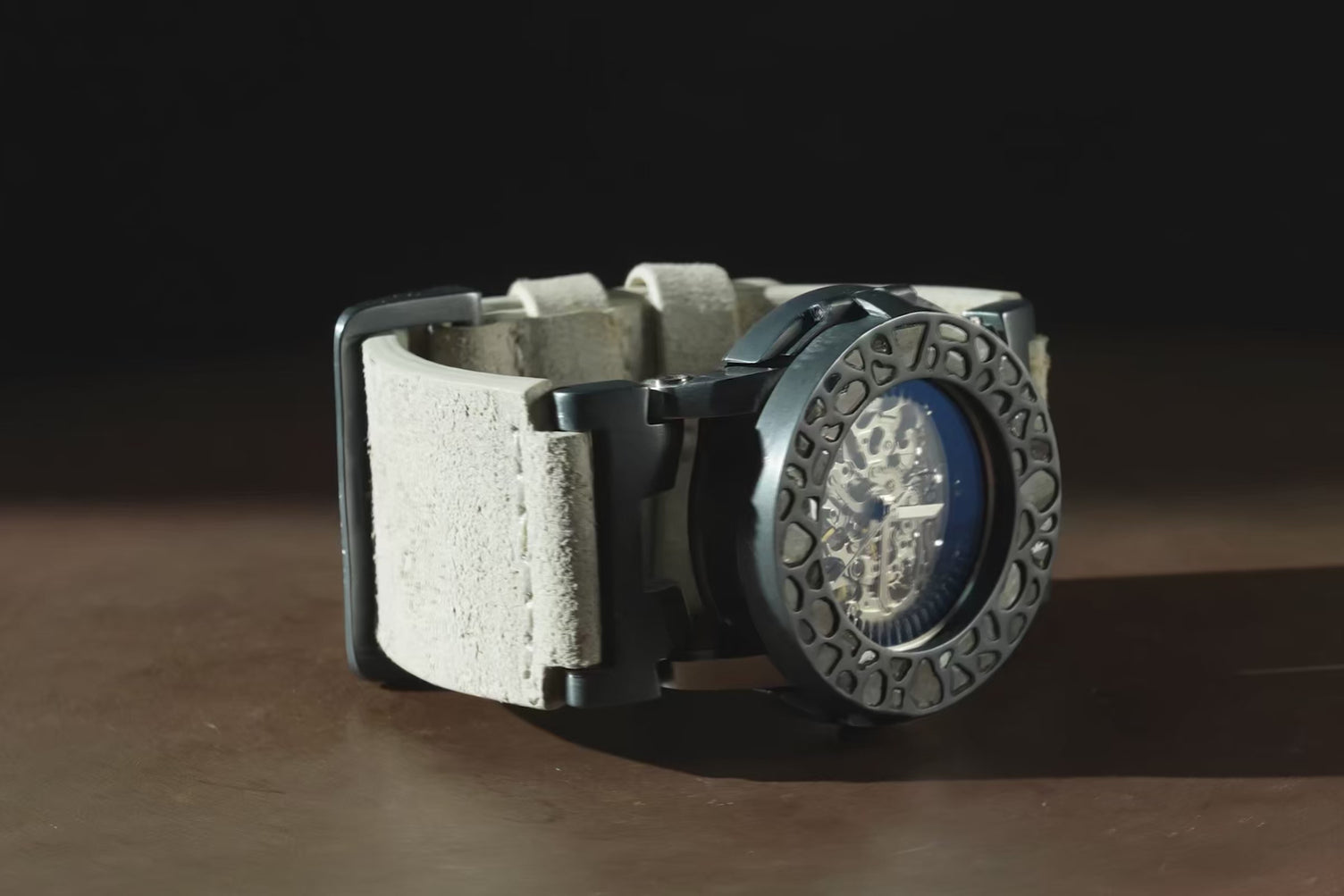 Double layer open worked dial smoked mineral glass; stainless steel turbine blades, matte black.Glass